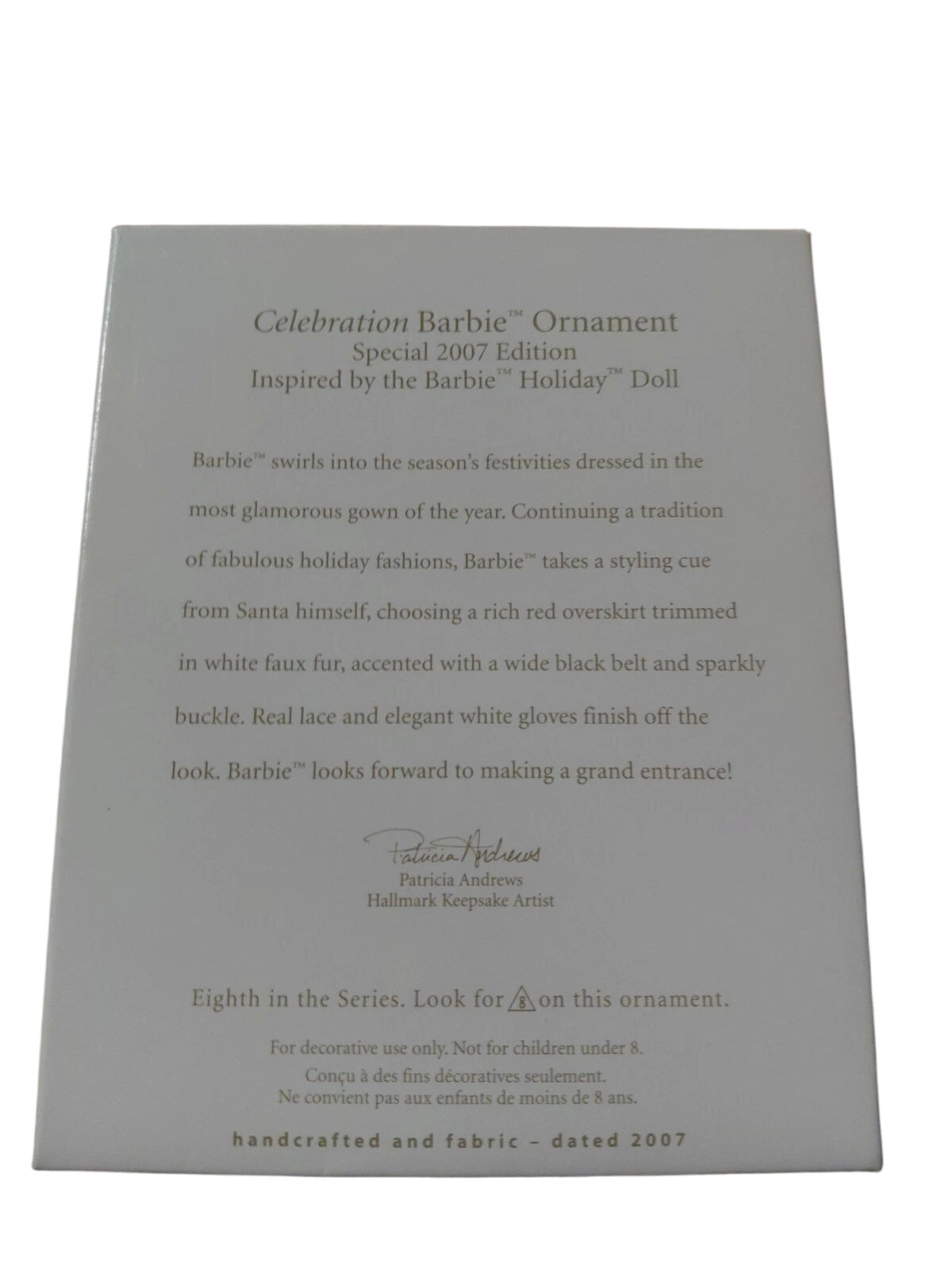 Welcome elegance into your holiday collection with the 2007 Hallmark Keepsake Celebration Barbie, a dazzling Special Edition—eighth in the iconic Barbie Celebration series. Barbie graces the season in a luxurious red velveteen gown accented with white faux fur trim, black lace overlay, real lace gloves, and a chic black belt with a sparkling buckle. Crafted from resin/plastic with a fabric skirt. Mint-in-box complete with tag and insert—no power needed.