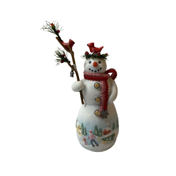 Welcome Colleen C. Evergreen, the 3rd delightful collectible in Hallmark’s Snowtop Lodge series, launched in 2007 (item QX7157). This charming snow-lady wears a wreath of evergreen atop her head and holds a leafy branch, where two bright red cardinals perch. The porcelain figure stands on a scenic base depicting a winter family tree harvest, complete with skaters and snowy cottages. Mint-in-box editions include the ornament, collector’s box, tag, and hanging loop. Decorative only—no batteries, cords, or lighting are required.