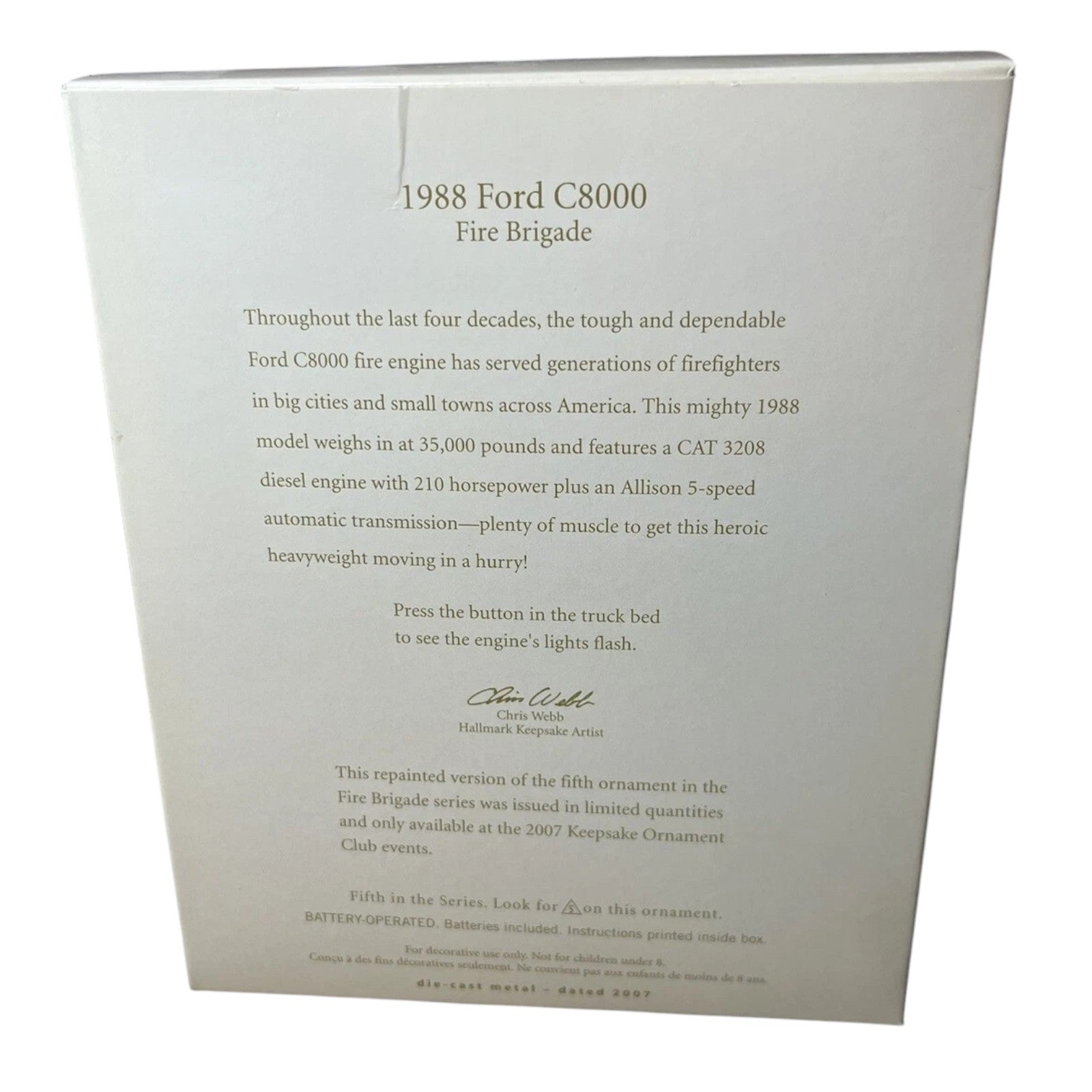 Celebrate the legacy of American firefighting with the 2007 Fire Brigade #5 ornament, featuring the iconic 1988 Ford C8000 fire engine. Part of Hallmark's Fire Brigade series, this die-cast metal ornament showcases the rugged design of the 1988 Ford C8000, a trusted workhorse in fire departments across the country. The ornament includes a light feature: press the button in the truck bed to see the engine's lights flash, adding a dynamic touch to your holiday display.
