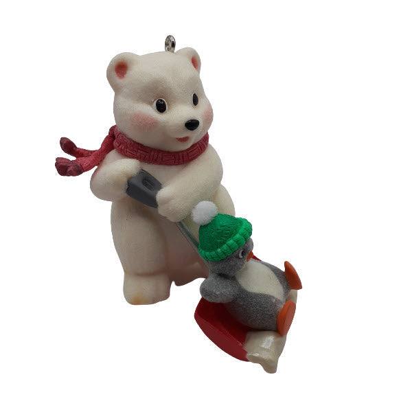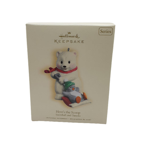 Join in snowy fun with 2007 Here's the Scoop (Snowball and Tuxedo), the seventh entry in Hallmark’s beloved Snowball and Tuxedo series. In this delightful scene, Snowball wears a red scarf and (literally) shovels snow while Tuxedo rides in a bright red sled in front—cheerful and playful holiday mischief. Crafted in flocked resin/plastic by artist Julie Forsyth, this collectible arrives in its original box and hang tag and requires no batteries, cords, or lights—hanging it up is all you need to do.
