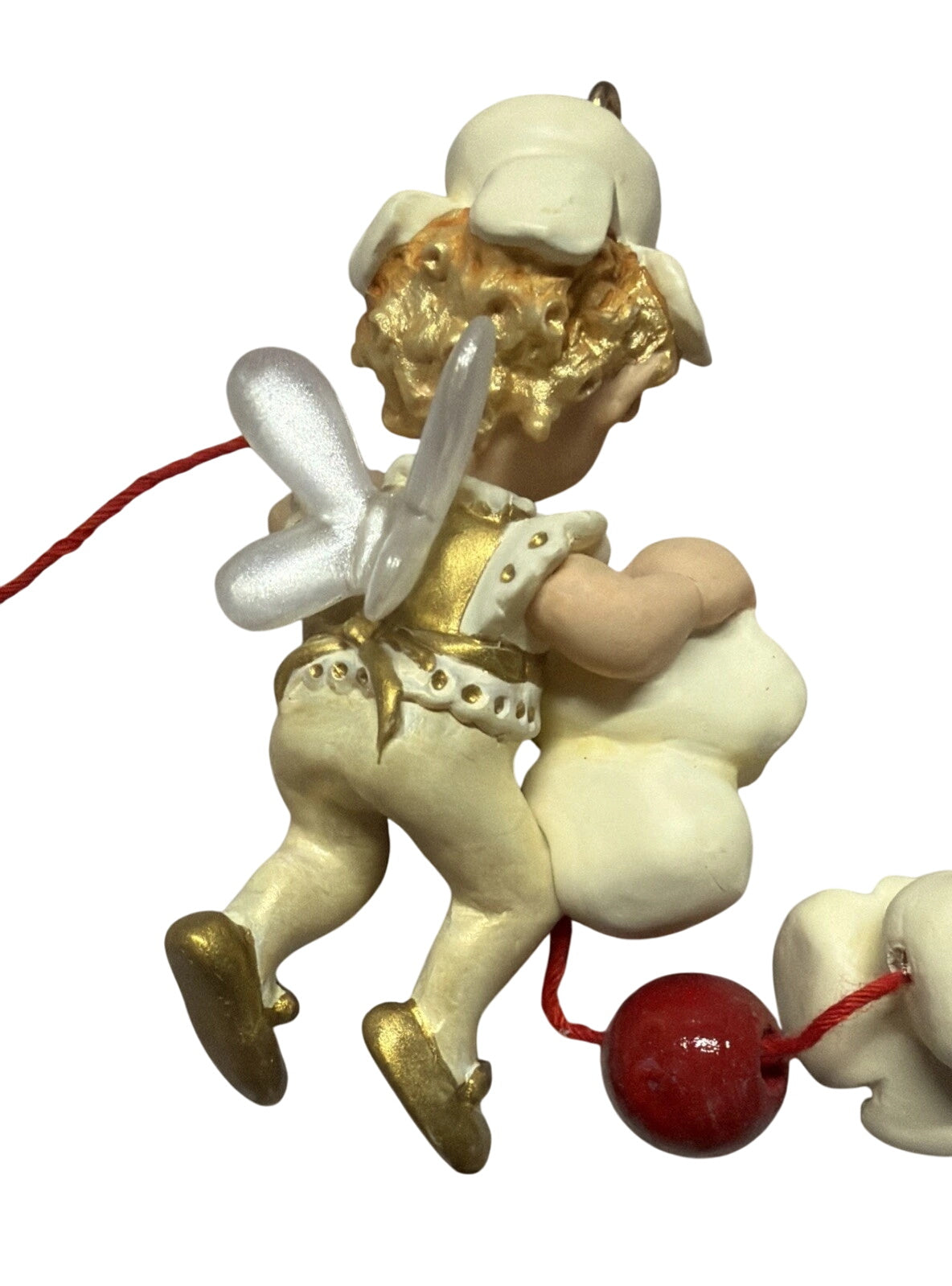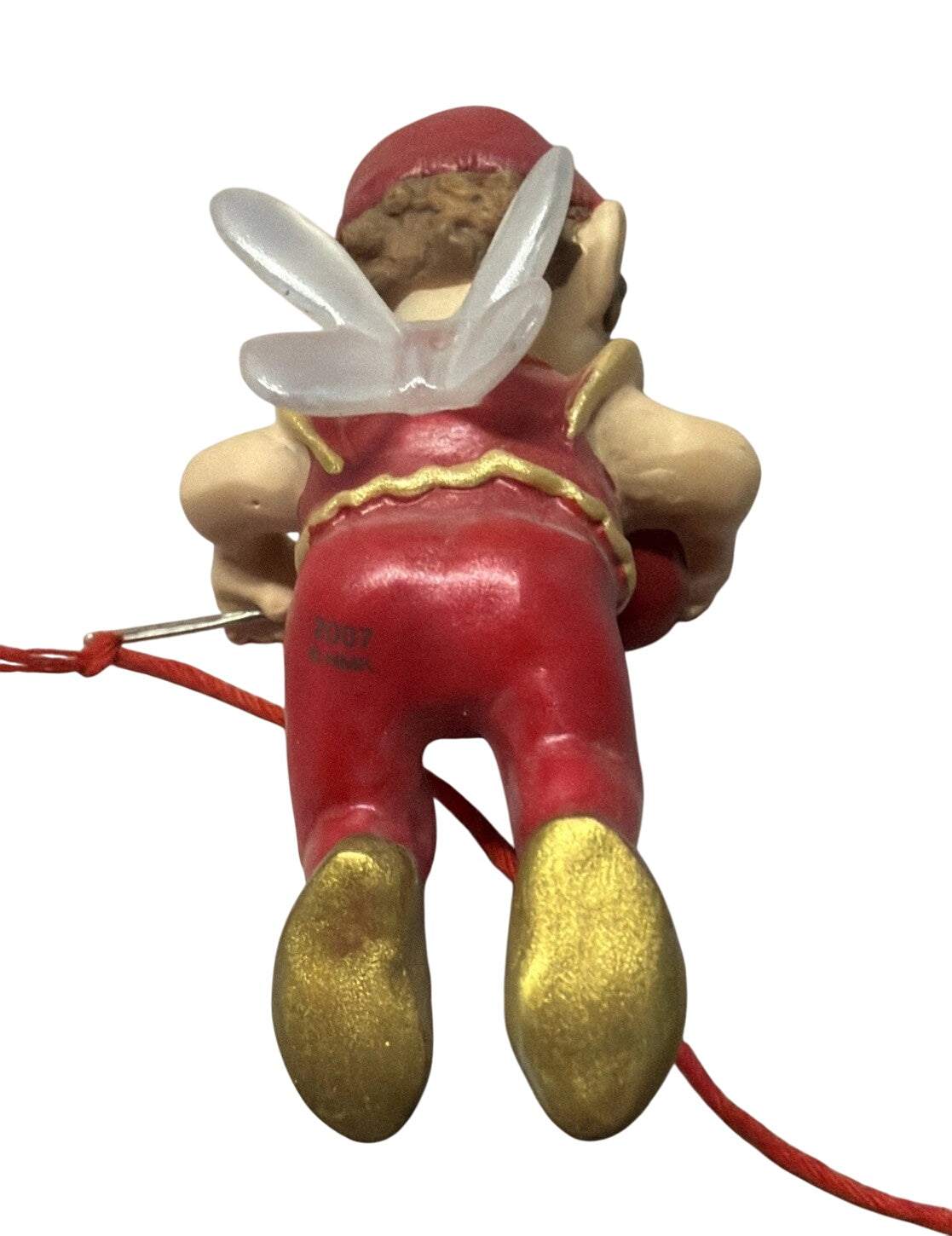 Add a festive touch of whimsy to your tree with 2007 Holiday String-Along (Angel), a Hallmark Keepsake ornament designed by Sue Tague. This playful piece features little “elf-like” friends busily stringing popcorn and berries to create old-fashioned garland—capturing the joy of holiday crafting. The Henry Ford catalog notes that the ornament is made of plastic and designed with multicolored detail.