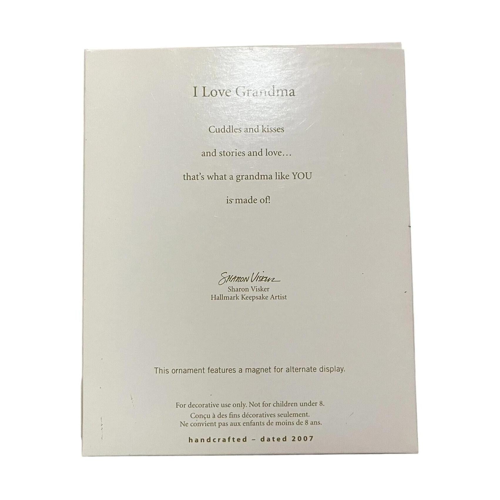 This 2007 edition from the Hallmark Keepsake line is a framed photo-holder ornament dedicated to “Grandma”. The design features a multicolored picture-frame style motif with the inscription “I ❤ Grandma 2007”, decorated with silver snowflakes and snow-family imagery (a big snowman and a little snowman). The ornament incorporates a magnet in the frame back for display flexibility (photo or magnet) or hanging on the tree. It makes a meaningful keepsake for a grandmother or a family holiday display highlighting grandparent-grandchild relationships.