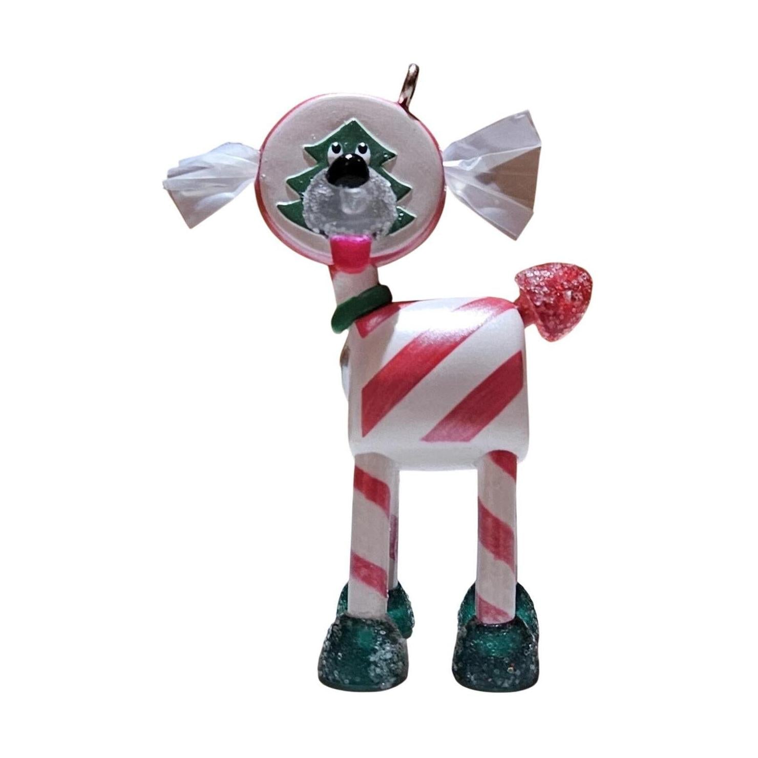 Sweeten your tree with the 2007 Hallmark Keepsake Ornament titled “Peppermint Pup” (SKU WD4095). Designed by Sue Tague, this adorable candy-themed puppy features a peppermint-striped body, a gumdrop tail, and festive red and white detailing. Its glossy finish and cheerful expression make it a heart-warming addition to any Christmas display. Originally released as a limited-quantity club-member exclusive at the 2007 Ornament Premiere event, this collectible is a favorite among pet lovers and confection-themed ornament collectors. Measuring just over 2½ inches tall, it perfectly captures the charm and playfulness of Hallmark’s signature holiday style.