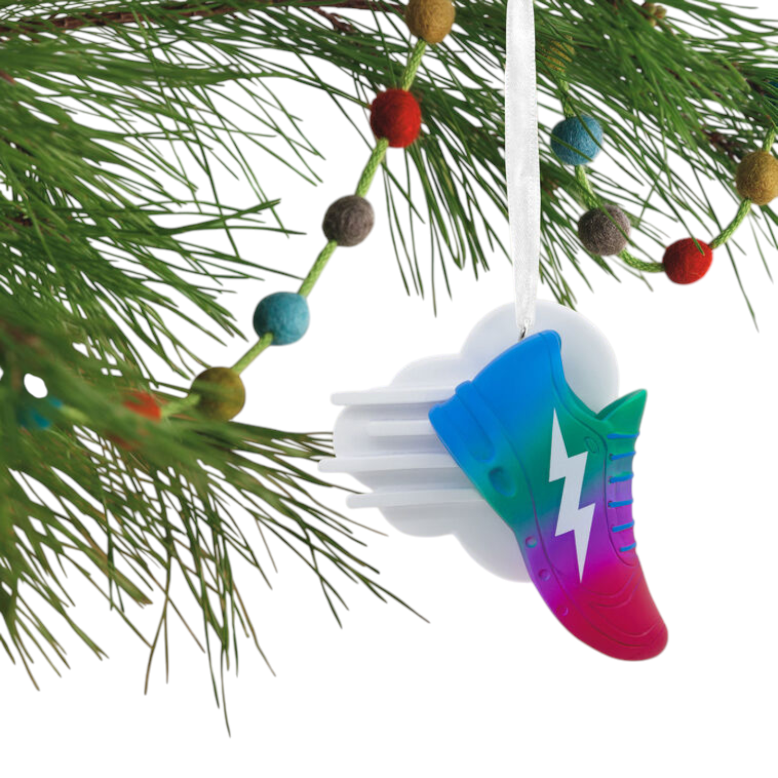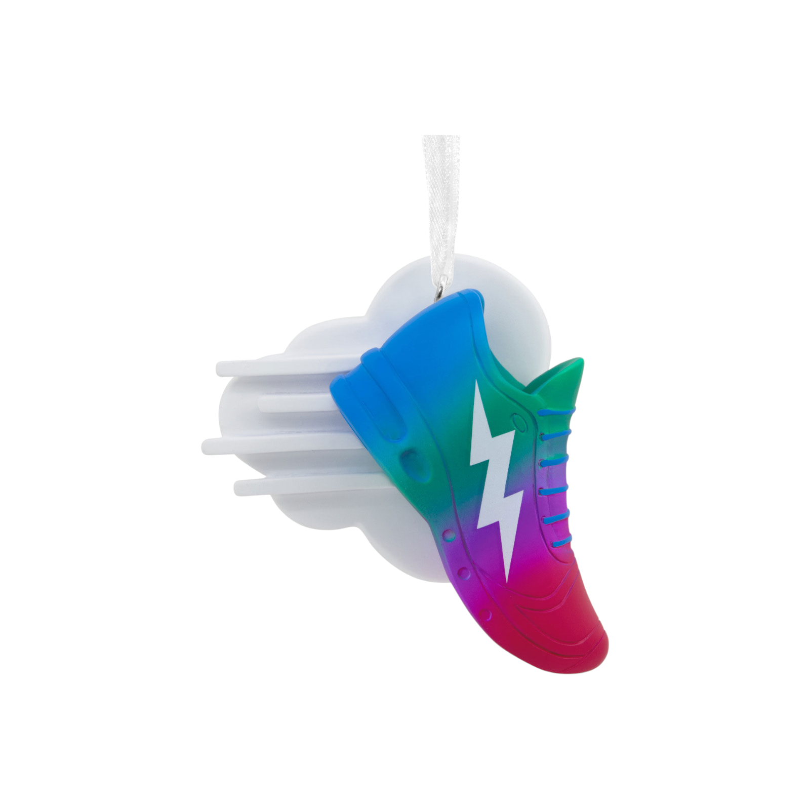 Capture the spirit of motion and athletic passion with the 2007 Running Shoes ornament from Hallmark’s Shoes series. This vibrant, multicolor sneaker—embellished with a striking lightning-bolt motif and poised against a soft cloud backdrop—perfectly embodies energy and enthusiasm. Often arriving mint in its original Keepsake box, it's a delightful gift for runners, coaches, or anyone inspired by the joy of the journey.