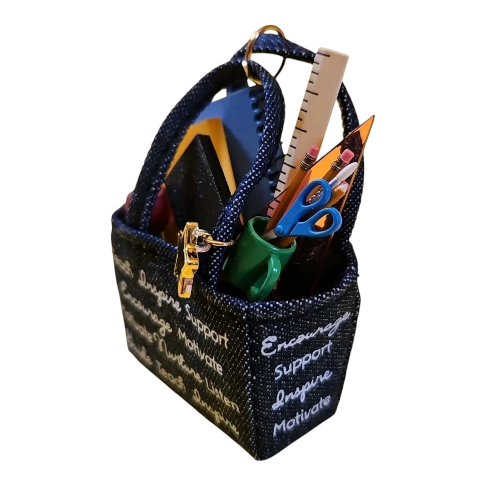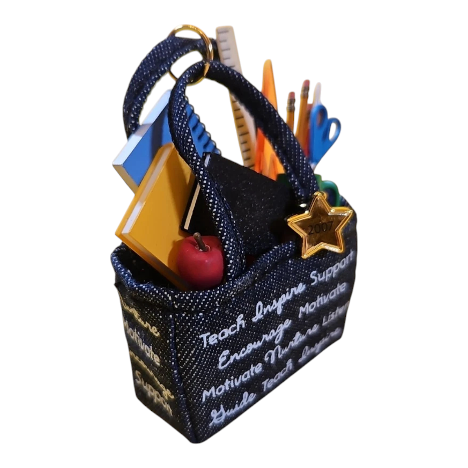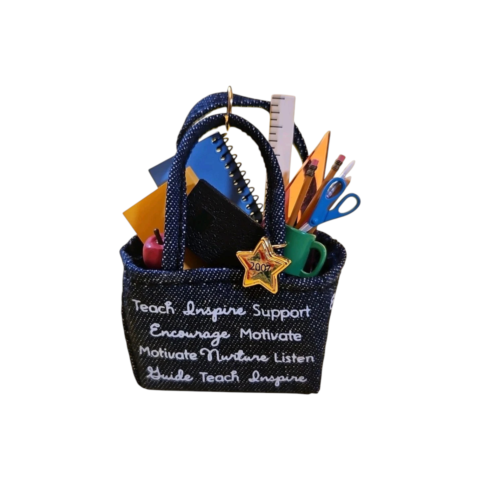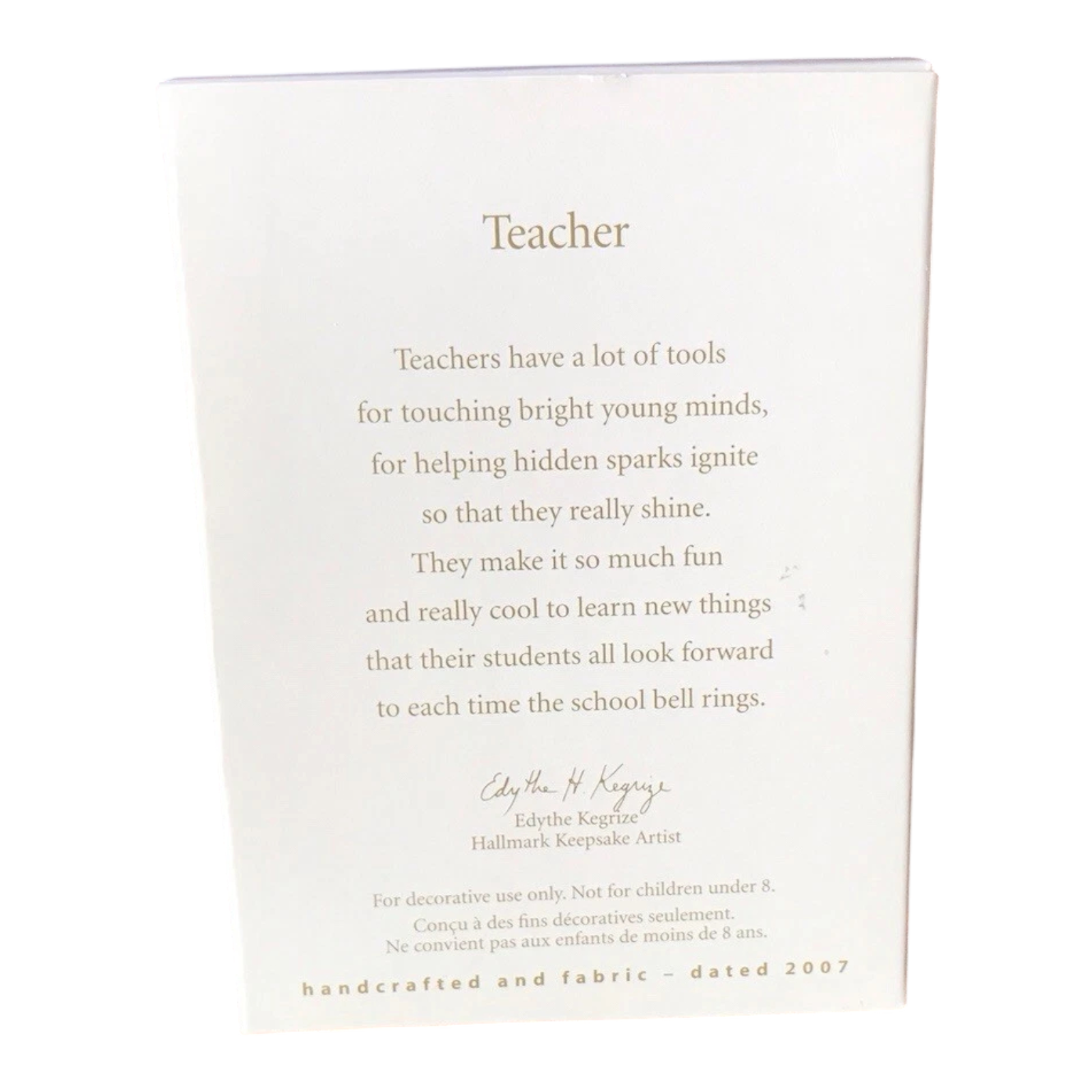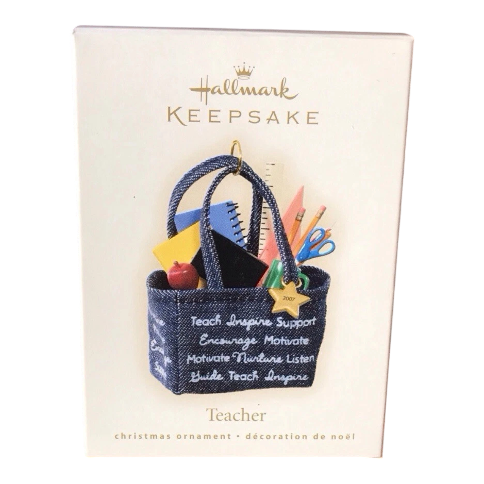 Celebrate the educators who inspire with this heartfelt 2007 Teacher ornament from Hallmark’s Teacher series. Crafted to resemble a charming cloth tote brimming with school supplies, it features motivational words like “Teach • Inspire • Support • Encourage • Motivate • Nurture • Listen • Guide” elegantly printed across the fabric. A gold star dated “2007” adds a sweet finishing touch. Mint in its original Keepsake box, it's a thoughtful tribute or gift that honors a teacher's impact with both style and sentiment.