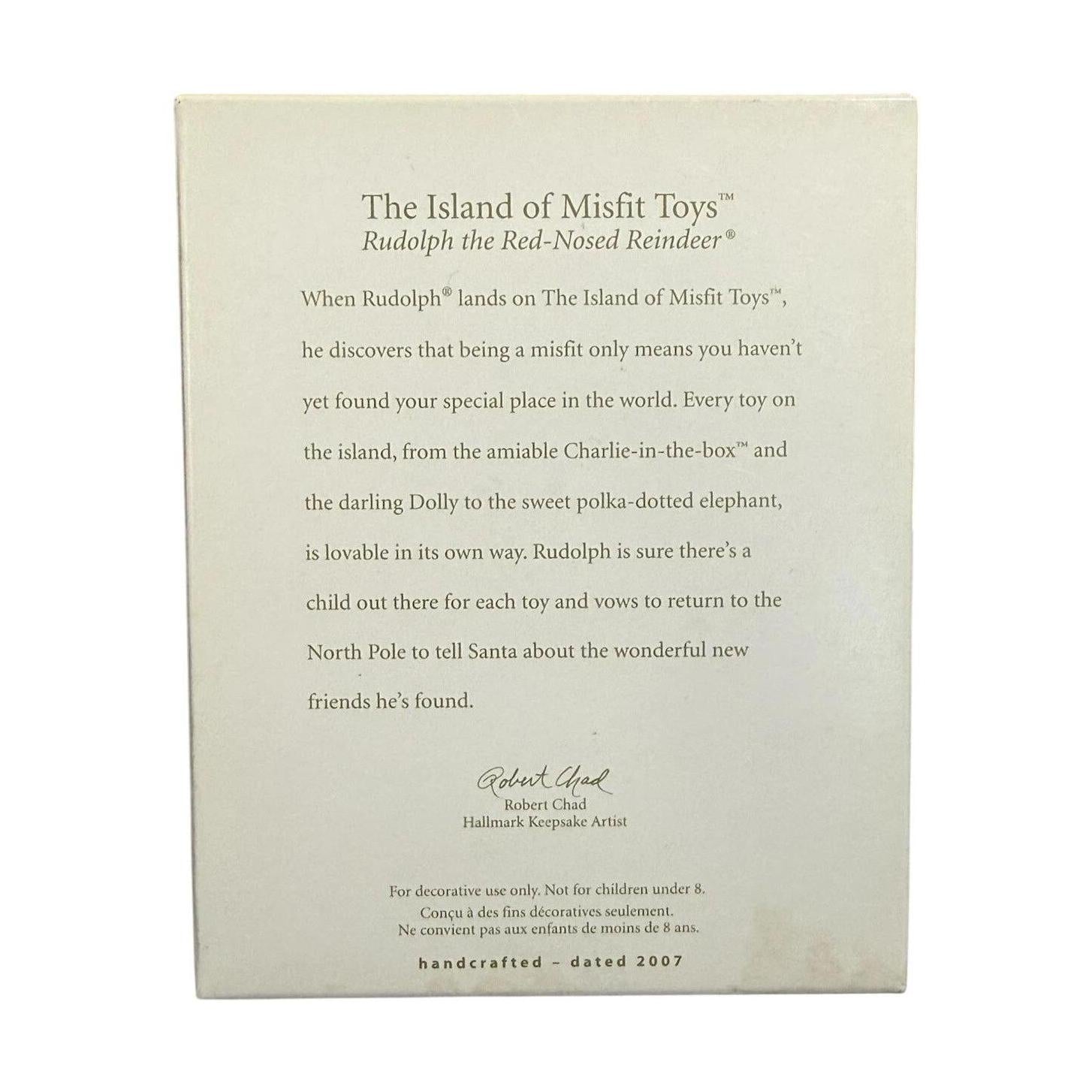 Bring home nostalgic charm with the 2007 The Island of Misfit Toys Keepsake ornament from the Rudolph the Red-Nosed Reindeer collection. This beautifully crafted ornament features Rudolph surrounded by beloved characters from the Island of Misfit Toys—like the polka-dotted elephant, the doll, and more—evoking warmth and sentiment from the classic holiday special. Created by artist Robert Chad and released in 2007, this multicolor keepsake stands about 3.467″ high × 2.940″ wide × 2.707″ deep in its presentation.