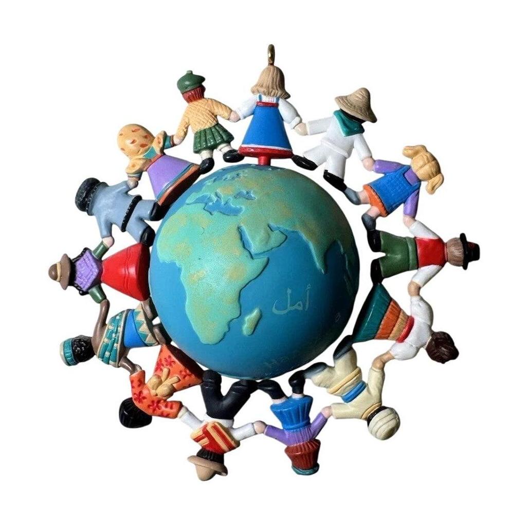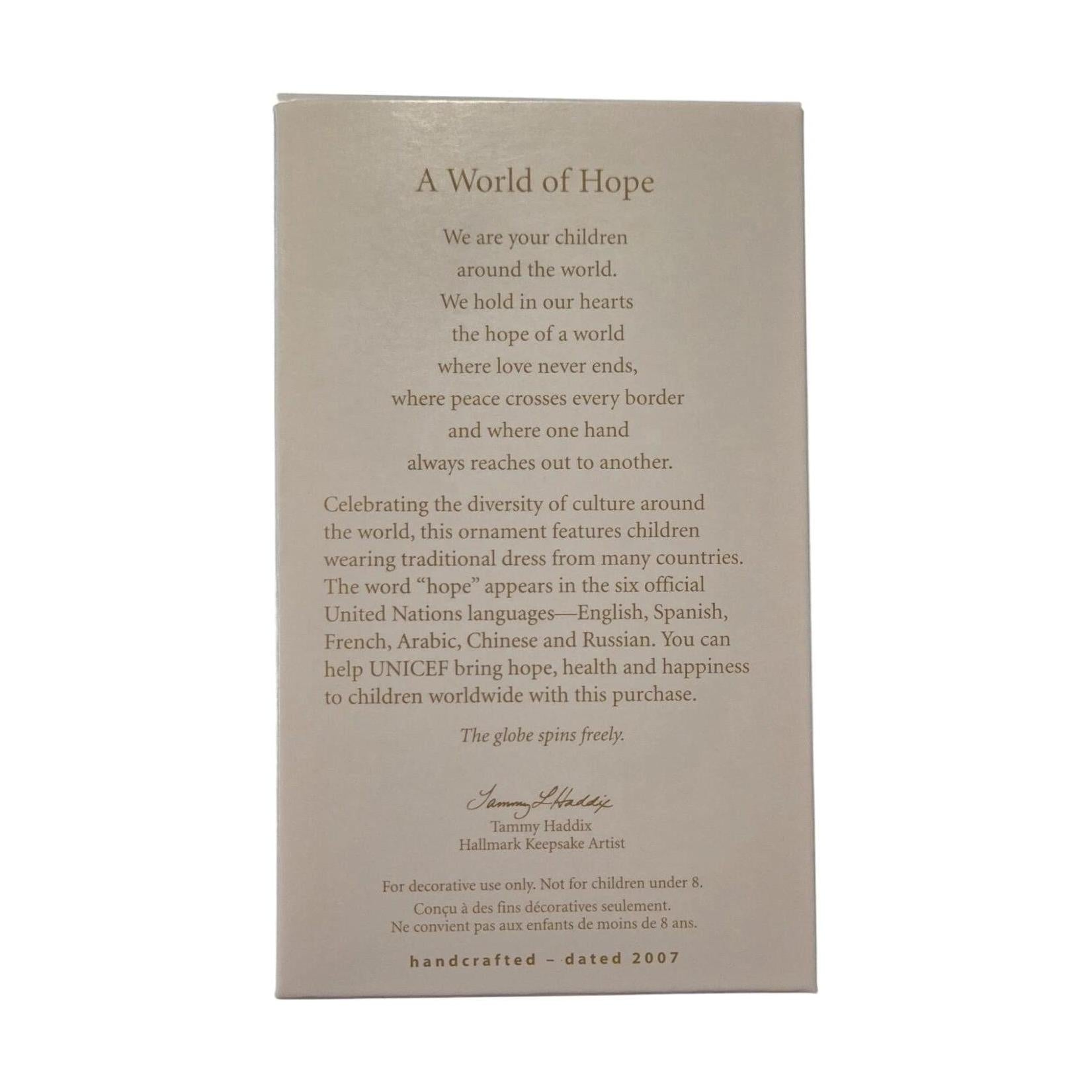 Celebrate global unity and hope with this beautiful charitable keepsake: 2007 UNICEF A World of Hope. The ornament features a spinning globe encircled by figurines of children from many nations, each dressed in culturally representative attire, holding hands around the world. The globe bears the word “Hope” in six official United Nations languages: English, Spanish, French, Arabic, Chinese, and Russian.