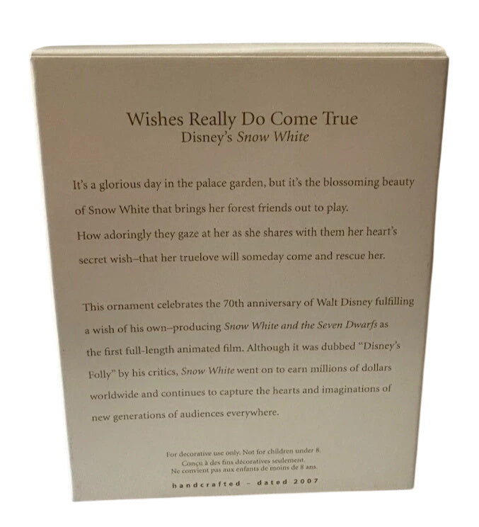 Celebrate the 70th anniversary of Disney’s classic Snow White with the 2007 edition of the Hallmark Keepsake Ornament titled “Wishes Really Do Come True” (SKU QXD4269). In this elegant design, Snow White leans gracefully on a wishing well while a bright red bird perches on her gloved finger, capturing the timeless magic of her enchanted story. Sculpted by artist Katrina Bricker, the painted resin figure stands approximately 4″ tall. This ornament combines nostalgic Disney charm, fine detailing and holiday collectible quality—perfect for fans of the princess, classic animation, and keepsake ornament collectors alike.