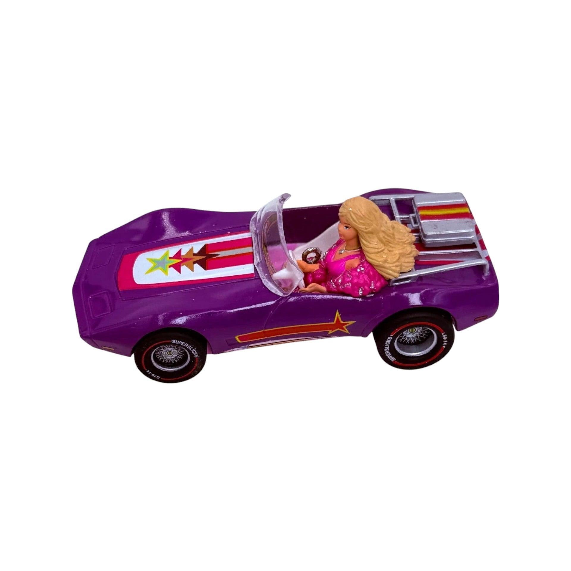 The 2008 Barbie Star Vette ornament captures Barbie cruising in style in her sleek purple Corvette, featuring bold orange racing stripes and retro “star” decals—perfect for an afternoon drive or a disco night out—designed by Anita Marra Rogers. The package includes the ornament, a Keepsake box, and an official Hallmark ornament tag (typical for Hallmark Keepsakes). The ornament boasts turning wheels for added fun—no batteries, cords, or lighting features are required.