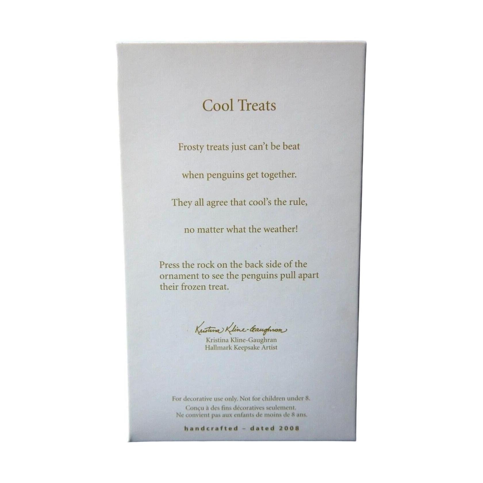 Chill out with festive whimsy—introducing 2008 Cool Treats, a delightful addition to Hallmark’s unofficial Kris’ Penguins collection. This animated ornament features three adorable penguins sharing a popsicle as a friendlier way to split a frozen treat. Simply push the rock on the back to see them pull it apart—no batteries needed! Designed by Kristina Kline-Gaughran, this charming keepsake captures holiday fun in a playful, collectible form.