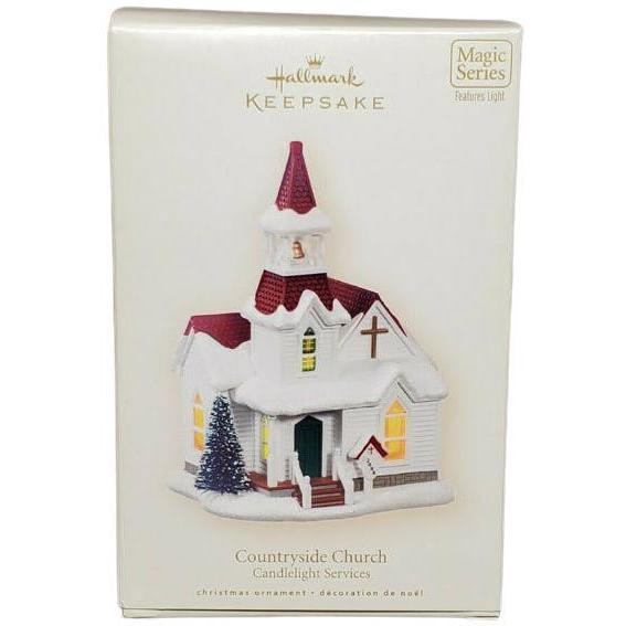 Bring the charm of a white clapboard country chapel into your holiday decor with this 2008 ornament, the 11th in Hallmark’s Candlelight Services Magic series. Featuring Victorian/Gothic Revival styling—complete with stained‑glass windows, a red steeple, and snow-dusted roof—this miniature lit church glows softly when connected to a UL-listed miniature tree-light bulb (bulb & cord included). Mint-in-box condition with tag and instructions, no batteries needed