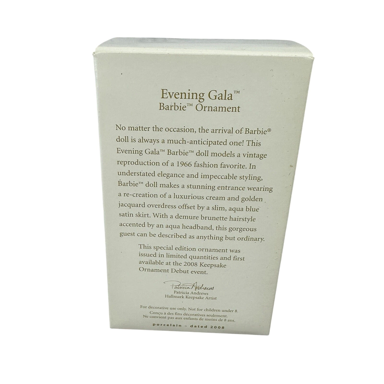 Step into a world of elegance with the 2008 Evening Gala (Barbie) porcelain ornament, a Limited Quantity Hallmark Keepsake that was released during the 2008 Ornament Debut Weekend. Barbie is portrayed in a sophisticated evening gown, complete with a stylish up-do and feathered headband. Designed with intricate detail and high-quality porcelain craftsmanship, this collectible showcases Barbie at her most glamorous. The package includes the ornament, a Keepsake box, and an official Hallmark tag. This ornament is purely decorative and does not require batteries, cords, or light strings.