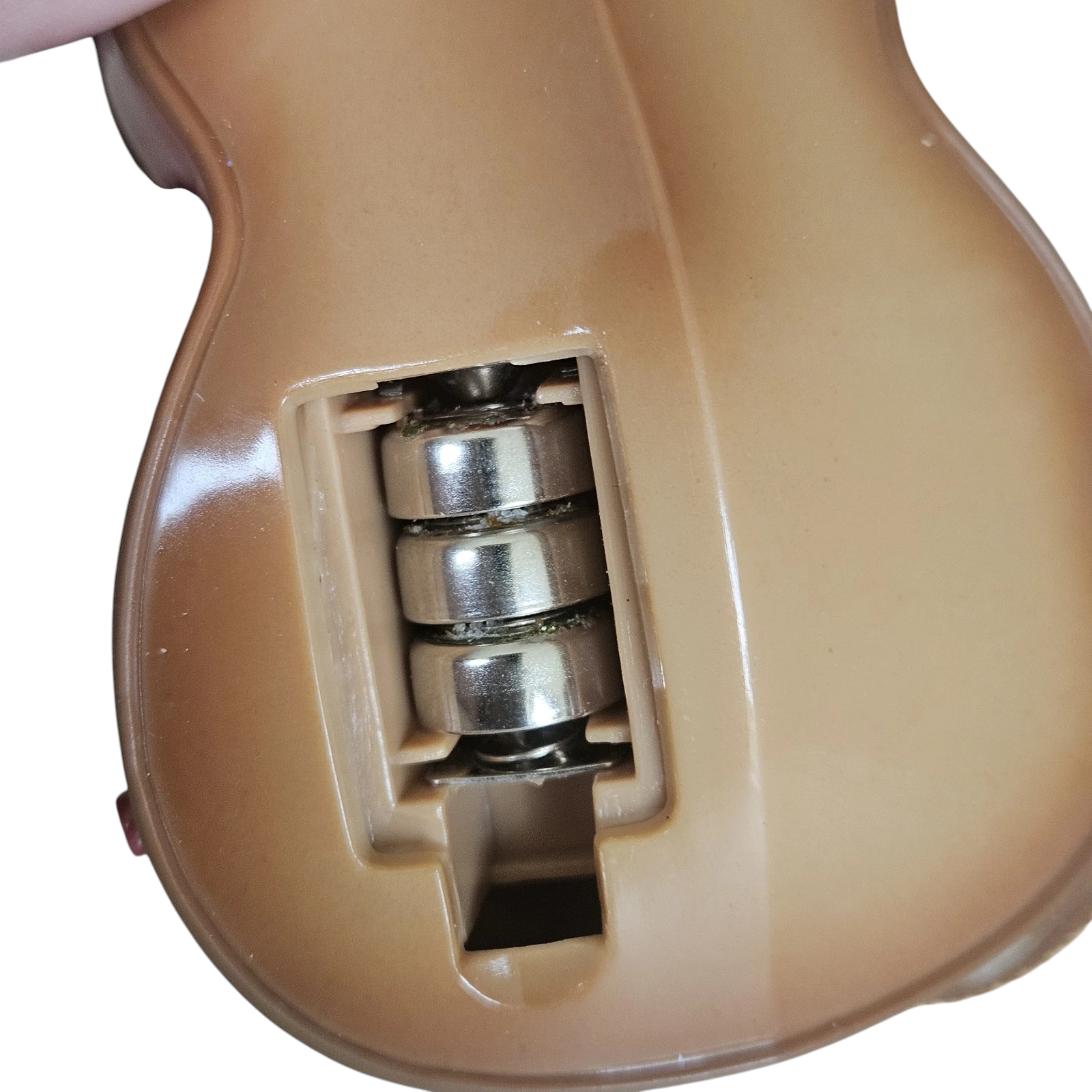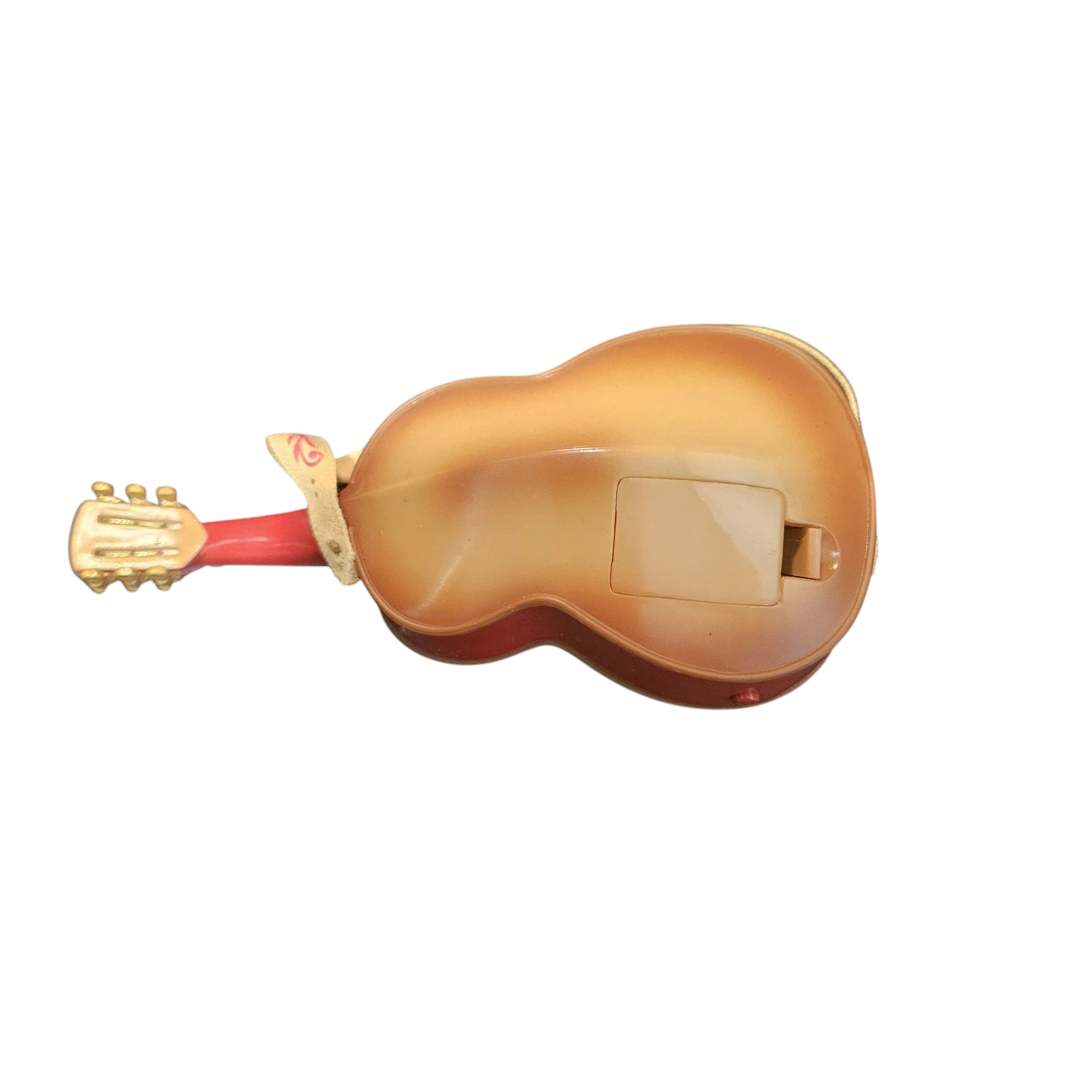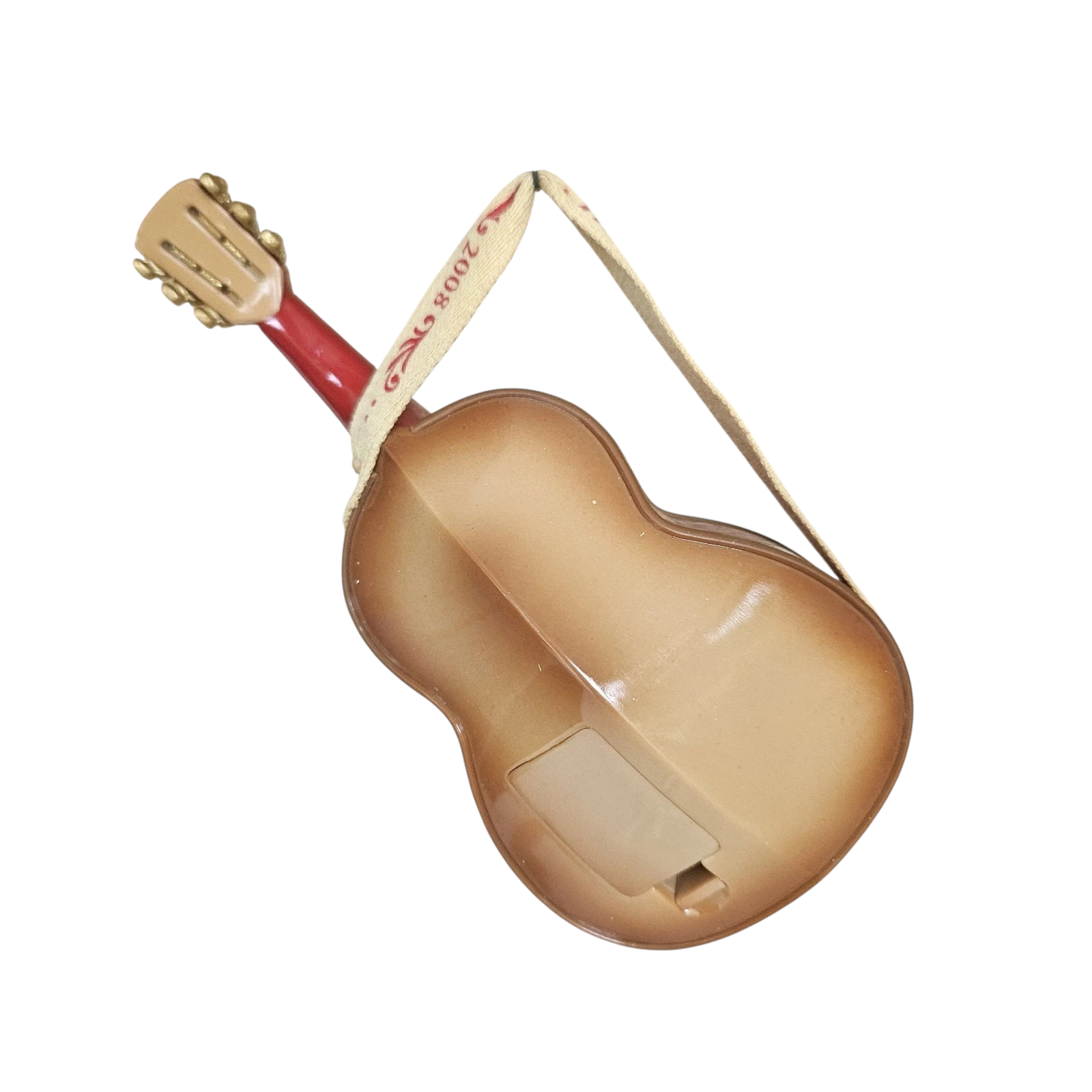 Bring festive flair with the 2008 Feliz Navidad guitar ornament, a Gold Crown exclusive from Hallmark's Magic collection. Shaped like a beautifully decorated green Spanish-style guitar, it features a press-button that plays the iconic holiday tune “Feliz Navidad” by José Feliciano. Crafted by artist Edythe Kegrize, the ornament includes three LR44 batteries and comes in its original box—no cords needed, just holiday cheer at the push of a button.