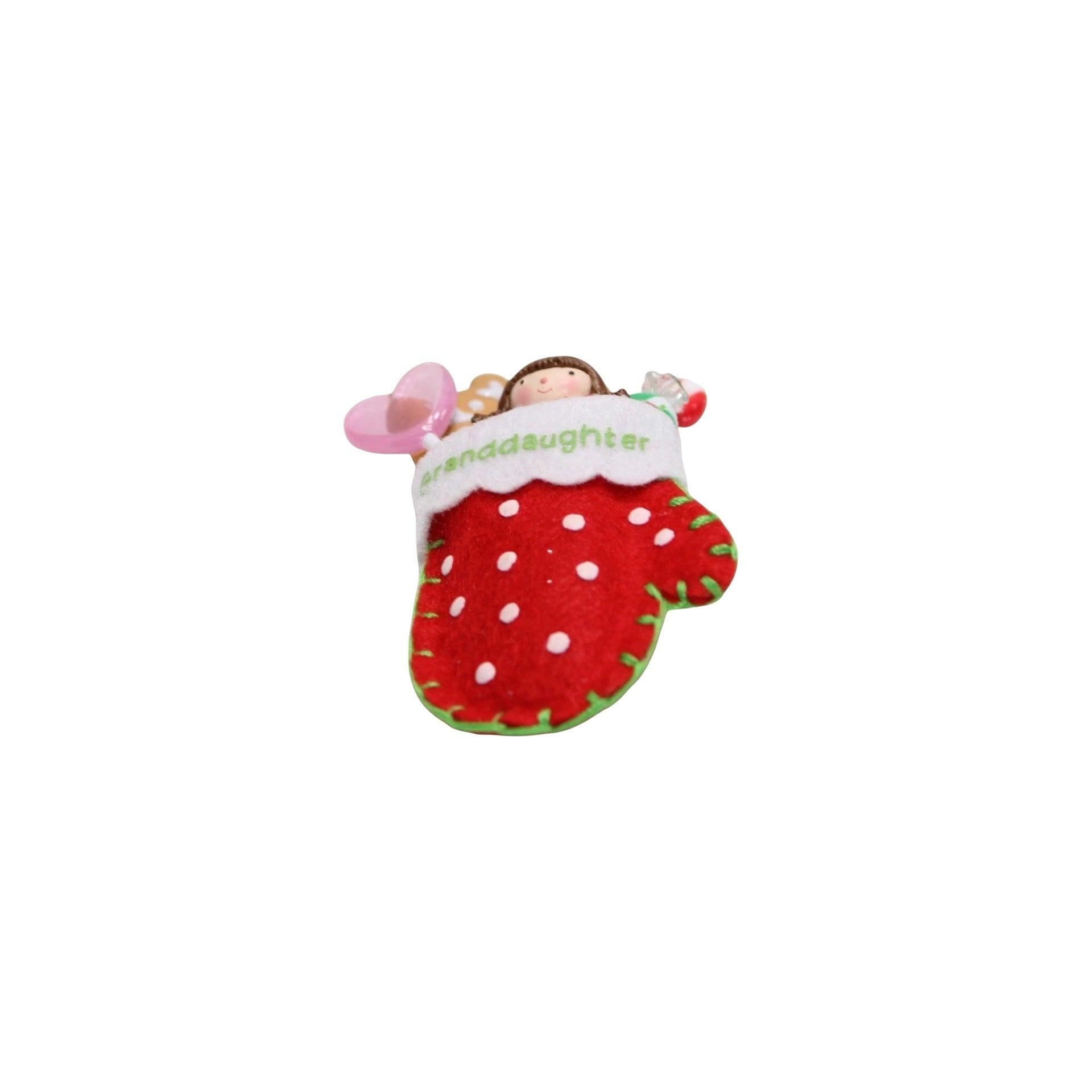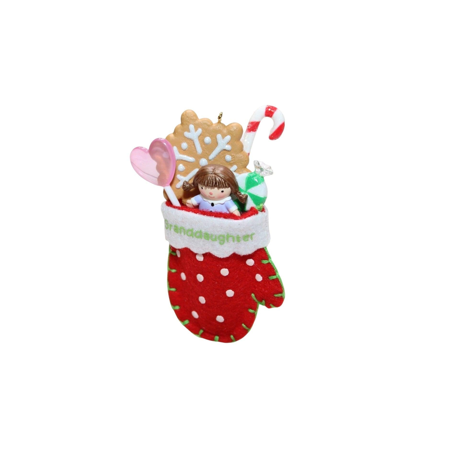 Celebrate the love of a granddaughter with the 2008 Granddaughter Keepsake Ornament by Hallmark. This charming piece features a red polka-dot fabric mitten filled with festive treats—a tiny doll, candy cane, and more—with the word “Granddaughter” stitched across the cuff. Designed by Terri Steiger, the handcrafted ornament brings heartwarming detail to any tree. It stands approximately 3½″ tall, arrives mint-in-box, and requires no power—simply hang and enjoy the sentimental sparkle.