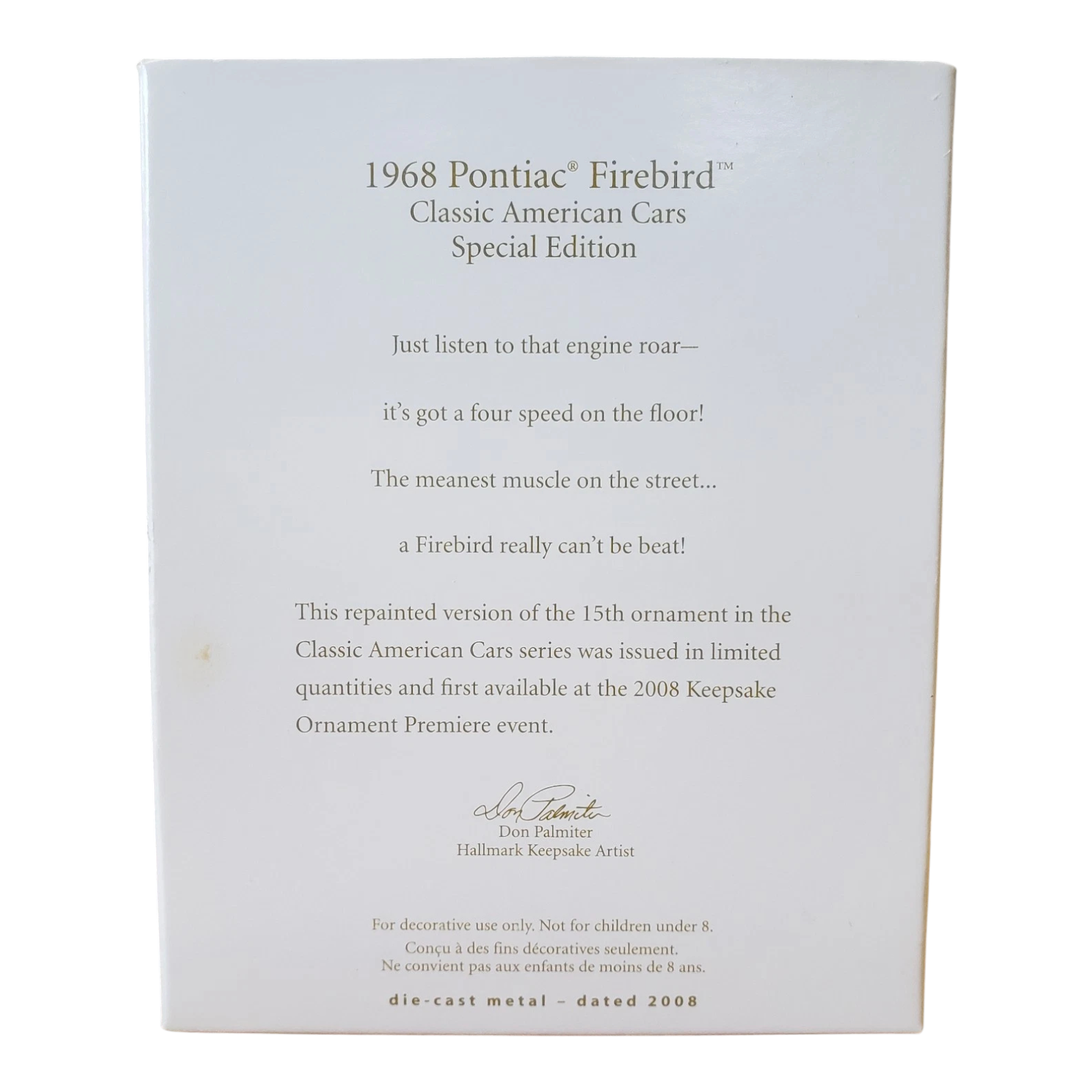 Ignite your festive display with the 1968 Pontiac Firebird Convertible, beautifully recreated as a 2008 GM‑licensed repaint of the original 2005 ornament—released as a limited‑quantity addition to Hallmark’s Classic American Cars series. Designed by Don Palmiter, this collectible die‑cast keepsake replicates the iconic Firebird with white paint, red interior, and rolling wheels for added flair. Mint‑in‑box and dated 2008, it requires no power—just hang it up and let this muscle icon roar through your holiday decor.