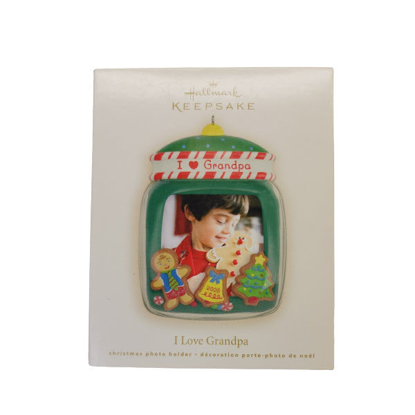 Celebrate the special bond between grandfather and grandchild with the 2008 edition of the Hallmark Keepsake Ornament titled I Love Grandpa (SKU QXG6161). Created by artist Sharon Visker, this charming piece is designed as a photo-holder: the front features the inscription “I Love Grandpa,” and a magnetic display option on the back allows for alternate display. The ornament is crafted in painted mixed-media, measures approximately 3.75″ tall, and is perfect for gifting to or celebrating that special “Grandpa” in one’s life.
