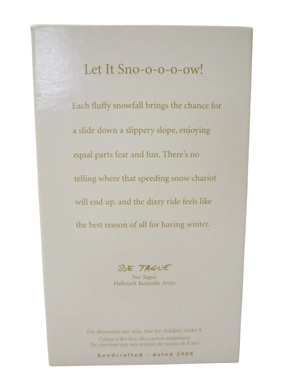 Bring the magic of a snow day to your Christmas tree with the 2008 Let It Sno-o-o-o-ow! (Child) ornament. This charming keepsake depicts a child joyfully sledding down a snowy hill, bundled in winter gear and with a bright expression of delight. The ornament captures the nostalgia of snow-bound childhood memories in sculpted detail—from the folds in the coat to the motion of the sled.