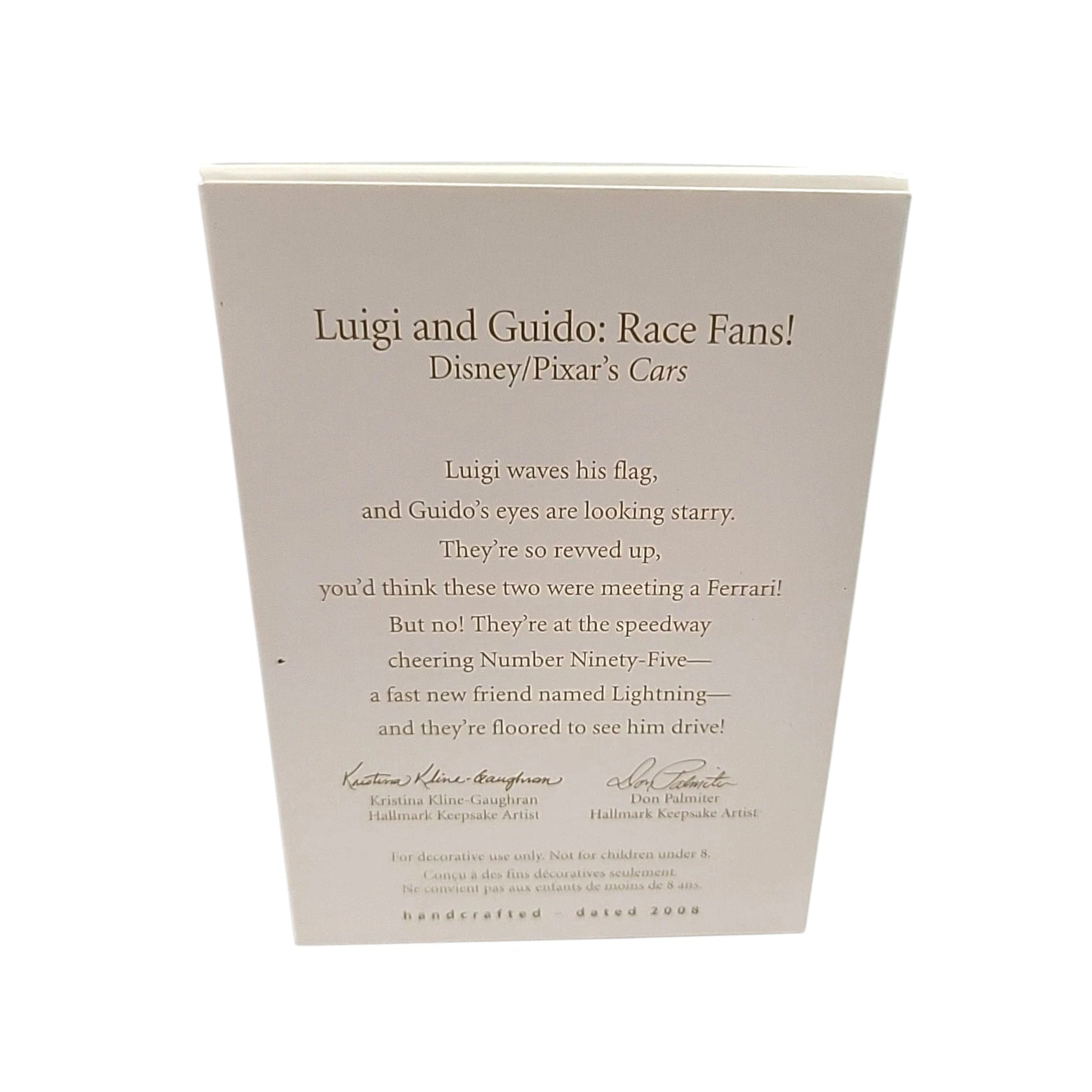 This 2008 Keepsake ornament set (SKU QXD4244) from Hallmark celebrates the duo from Cars with a miniature pair of characters—Luigi and Guido—both posed as enthusiastic race-fans, complete with cheering expressions and vibrant racing decor. Designed by Kristina Kline-Gaughran and sculpted by Don Palmiter, the set captures the fun and charm of the franchise with detailed resin mini-ornaments each sized under 2″ wide (Luigi about 1¾″ and Guido about 1½″) which makes them perfect for collectors of Disney-Pixar themed or racing-motif holiday pieces. Their compact size and beloved characters give this set special appeal for fan-oriented collections.