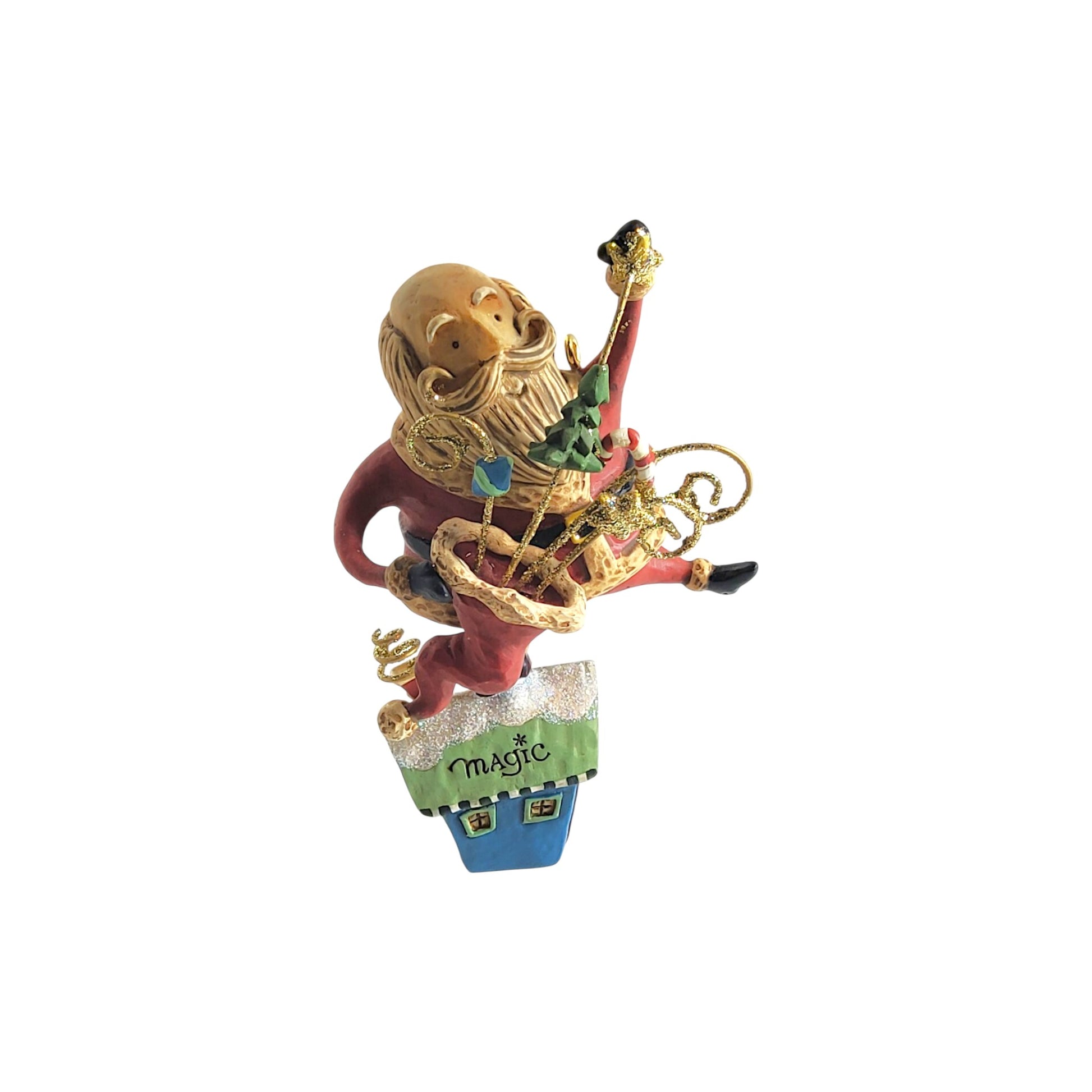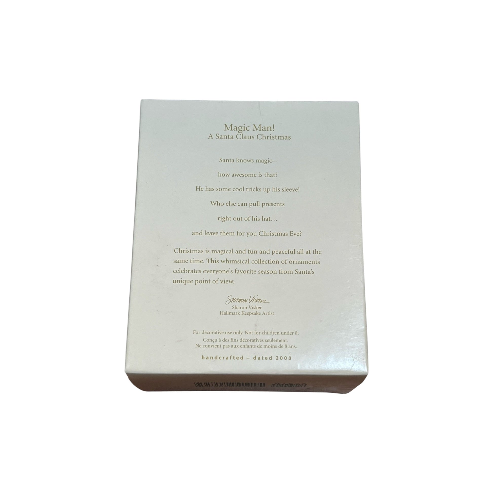 This ornament from Hallmark features a festive Santa Claus motif titled “Magic Man!”, released in 2008 as part of the “A Santa Claus Christmas” collection. Designed by artist Sharon Visker, it stands approximately 4½″ tall and is a Gold Crown exclusive.