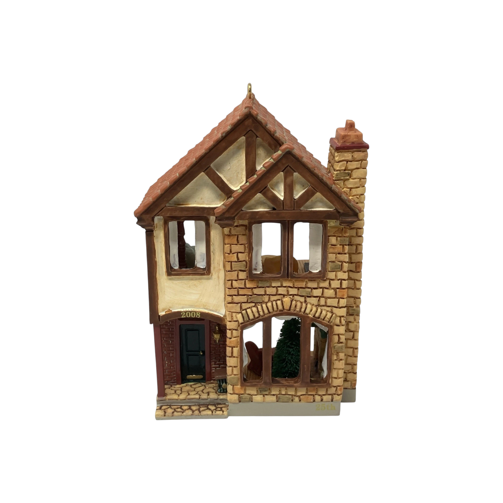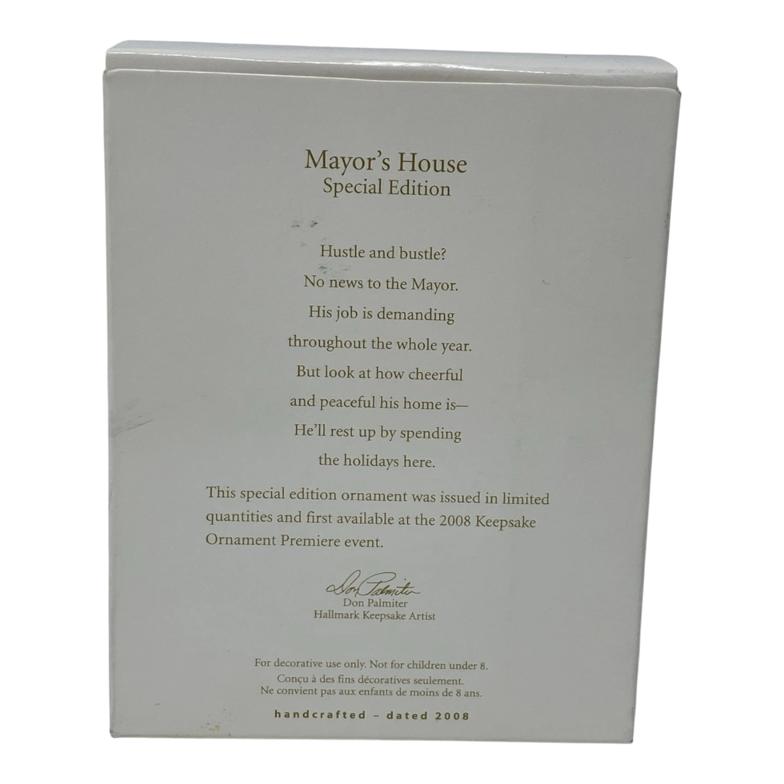 Celebrate 25 years of Hallmark’s Nostalgic Houses & Shops with the 2008 Mayor’s House, a limited-edition Premiere ornament crafted by Don Palmiter. This Tudor-style, two-story residence features brick-and-timber detailing, a pitched roof, and open interiors showcasing a festive living space and Christmas décor. Dated 2008 and measuring approximately 4½″ tall, it arrives in its original packaging with hang tag and requires no batteries or lights—ready to hang as a centerpiece of your nostalgic village.