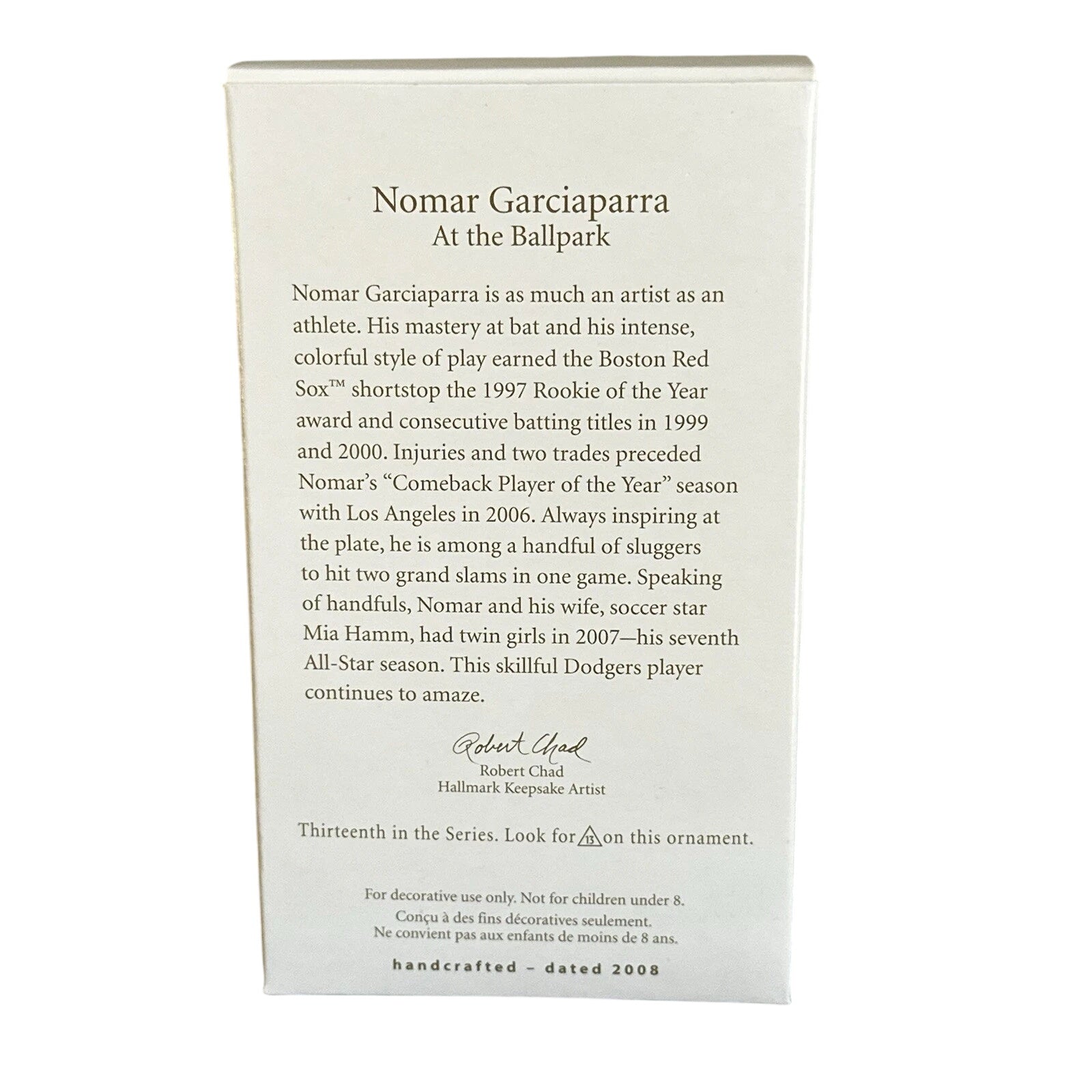 Hit a nostalgic homer with the 2008 Nomar Garciaparra, At the Ballpark ornament—Hallmark’s 13th release in the iconic At the Ballpark series. Capturing Nomar in full swing wearing a Dodgers uniform honoring their 50th anniversary (1958–2008), this collectible figurine brings both elegance and energy to your holiday décor. The ornament arrives in its original Collector’s Series packaging, complete with the signature Holiday Memory card. No batteries or cords required—just hang and enjoy the festive tribute to one of baseball’s most electrifying players.