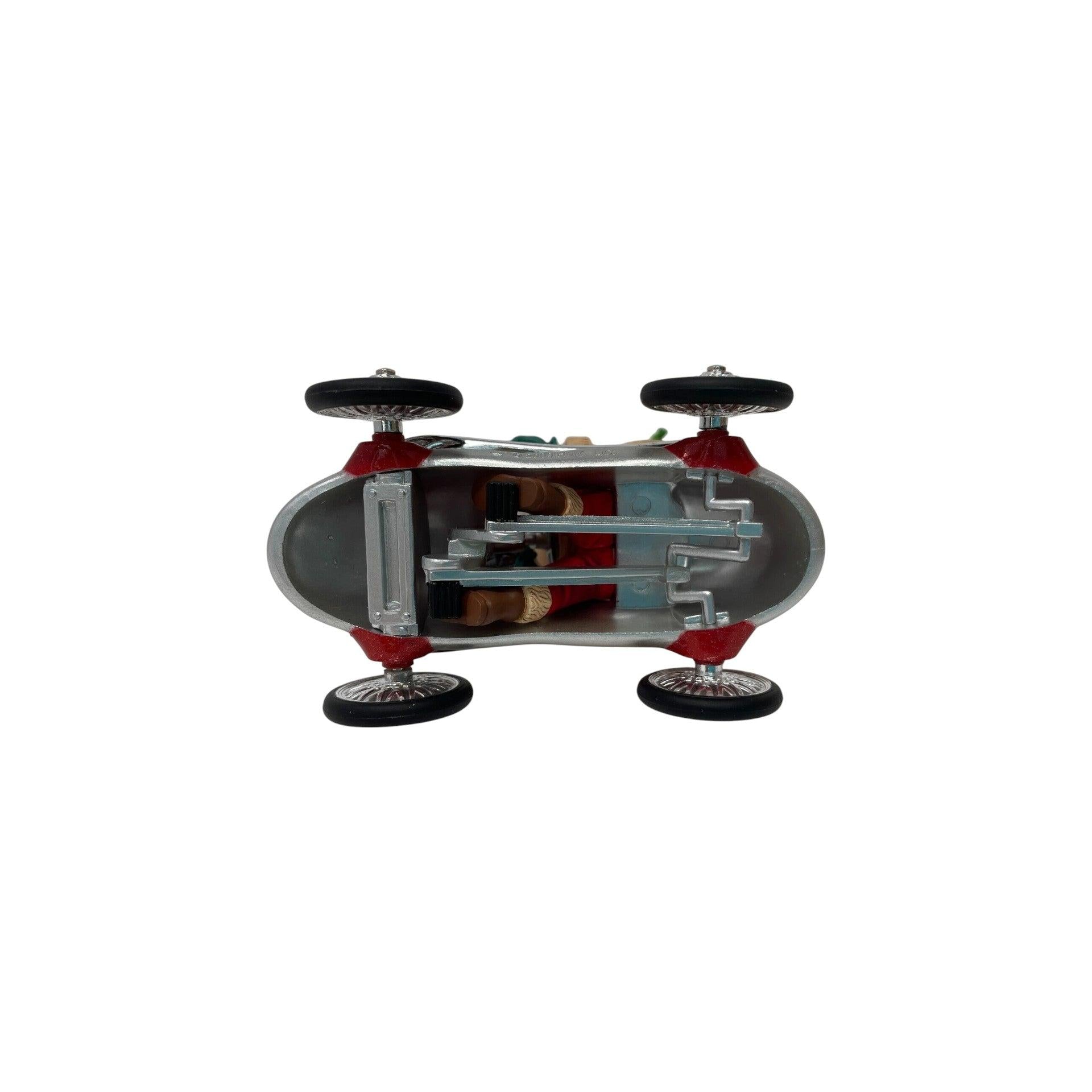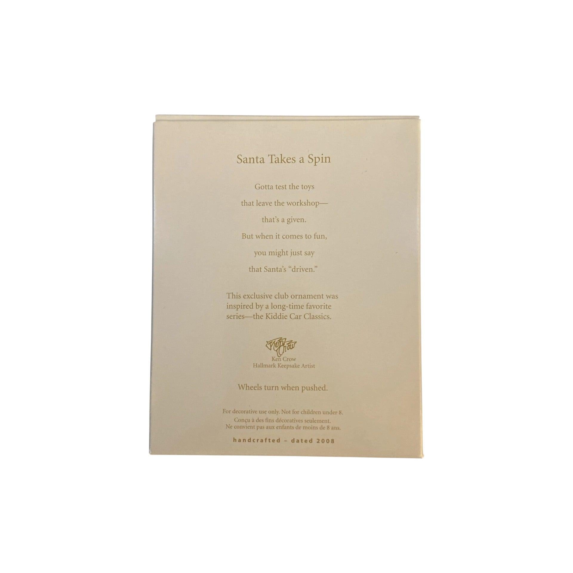 Rev up your holiday décor with the 2008 edition of the Hallmark Keepsake Ornament titled Santa Takes a Spin (SKU QX C8014). This club-edition piece features Santa in a racing-style pedal car instead of his usual sleigh—complete with sculpted details of the car, festive holiday accents and a hang loop. Designed by artist Ken Crow, it stands about 3″ tall and is crafted in painted resin/metal mixed media. Its playful blend of Santa tradition and racing theme makes it especially appealing to enthusiasts of cars, toy-style ornaments and Santa-collectibles.