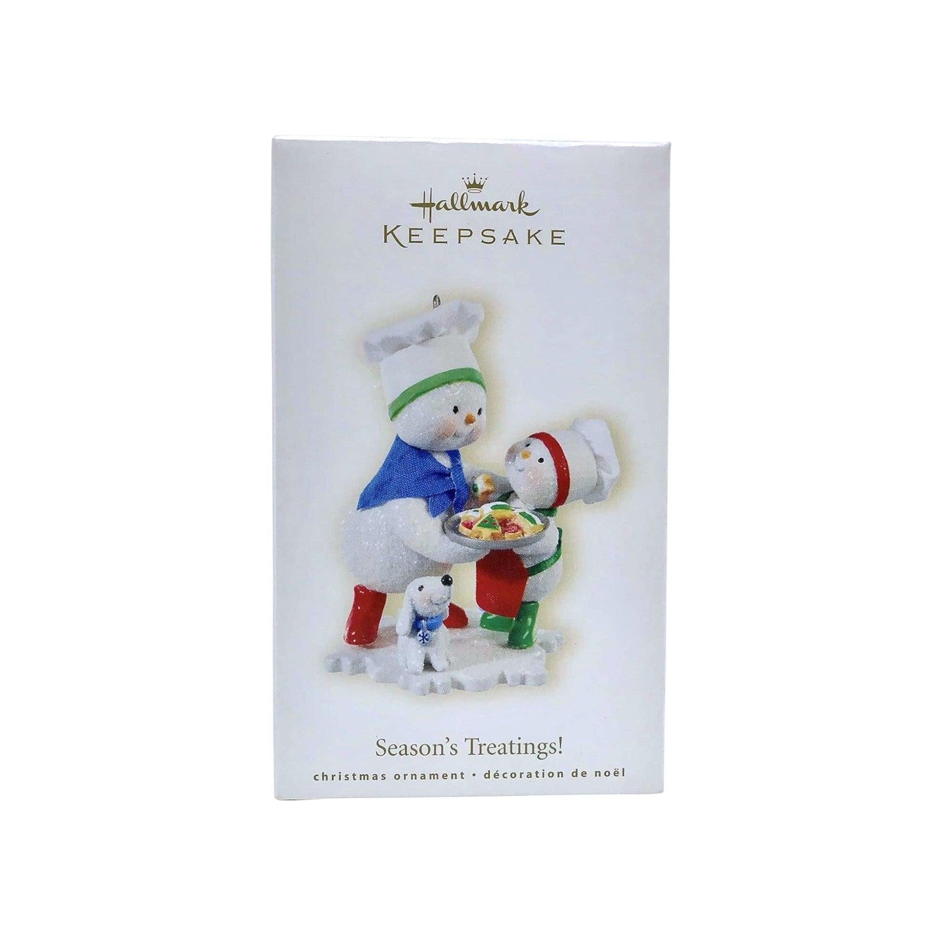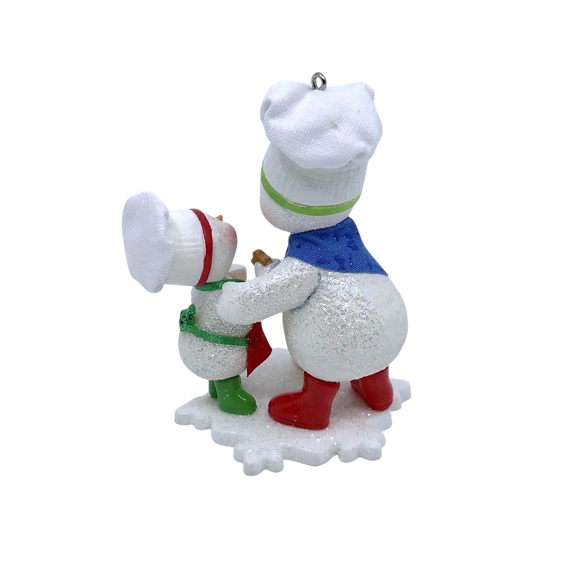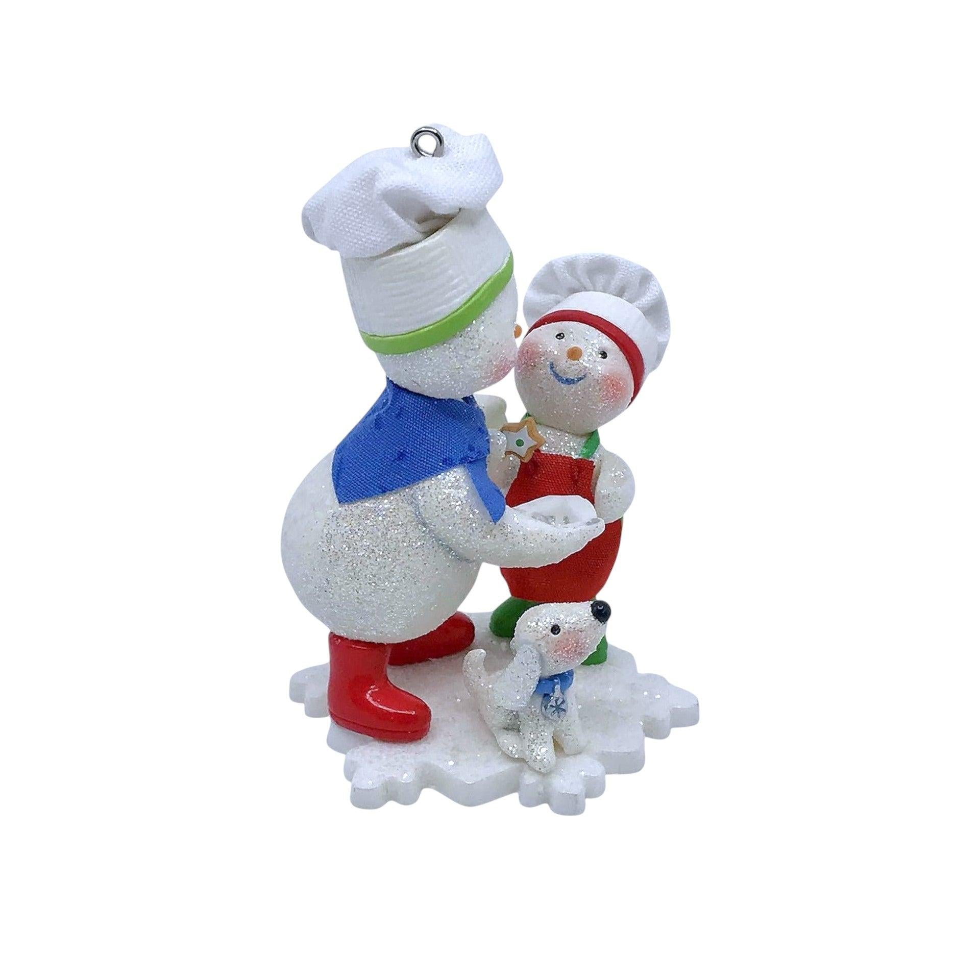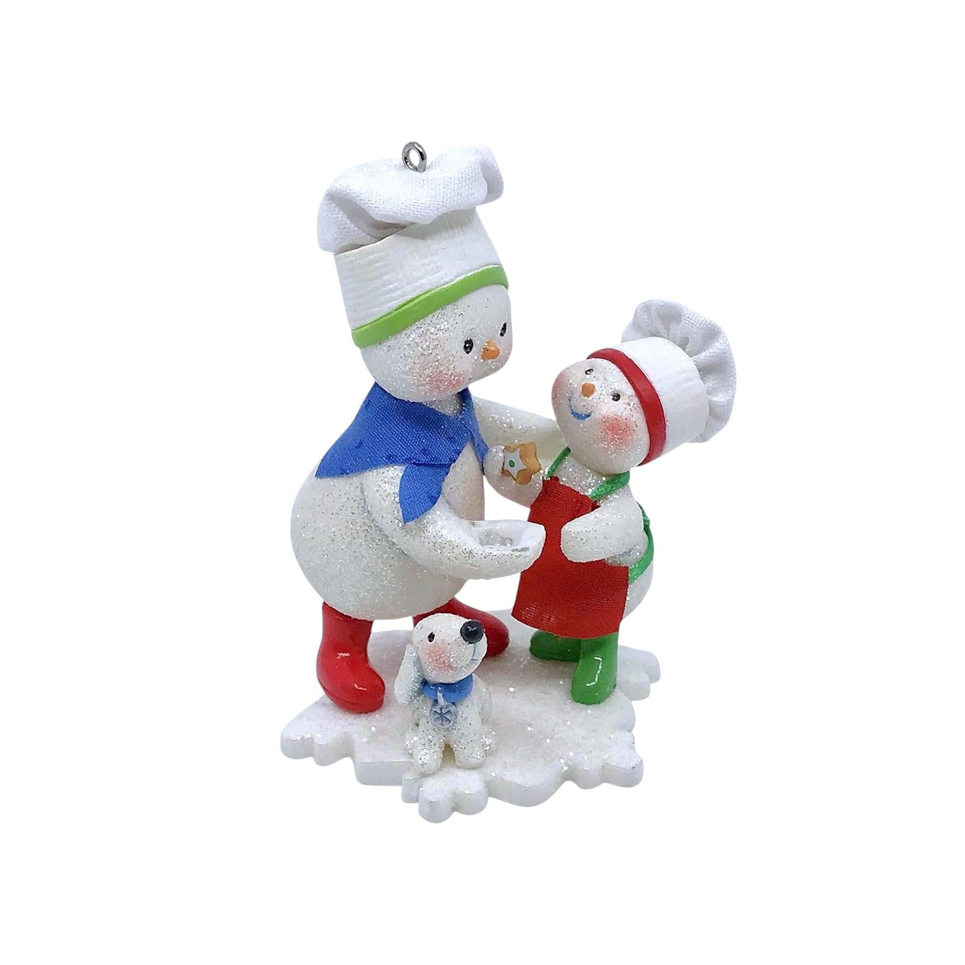 Warm hearts with the 2008 Season’s Treatings!, part of Hallmark’s playful Making Memories series. This charming resin ornament captures a snowman parent and child in chef hats baking colorful sugar cookies together, while an eager pup awaits the next tasty bite. Crafted by Tammy Haddix, it stands about 3.7" tall, and comes mint-in-box complete with original packaging and hang tag. No batteries, cords, or lights are required—just hang and let the festive scene brighten your décor.