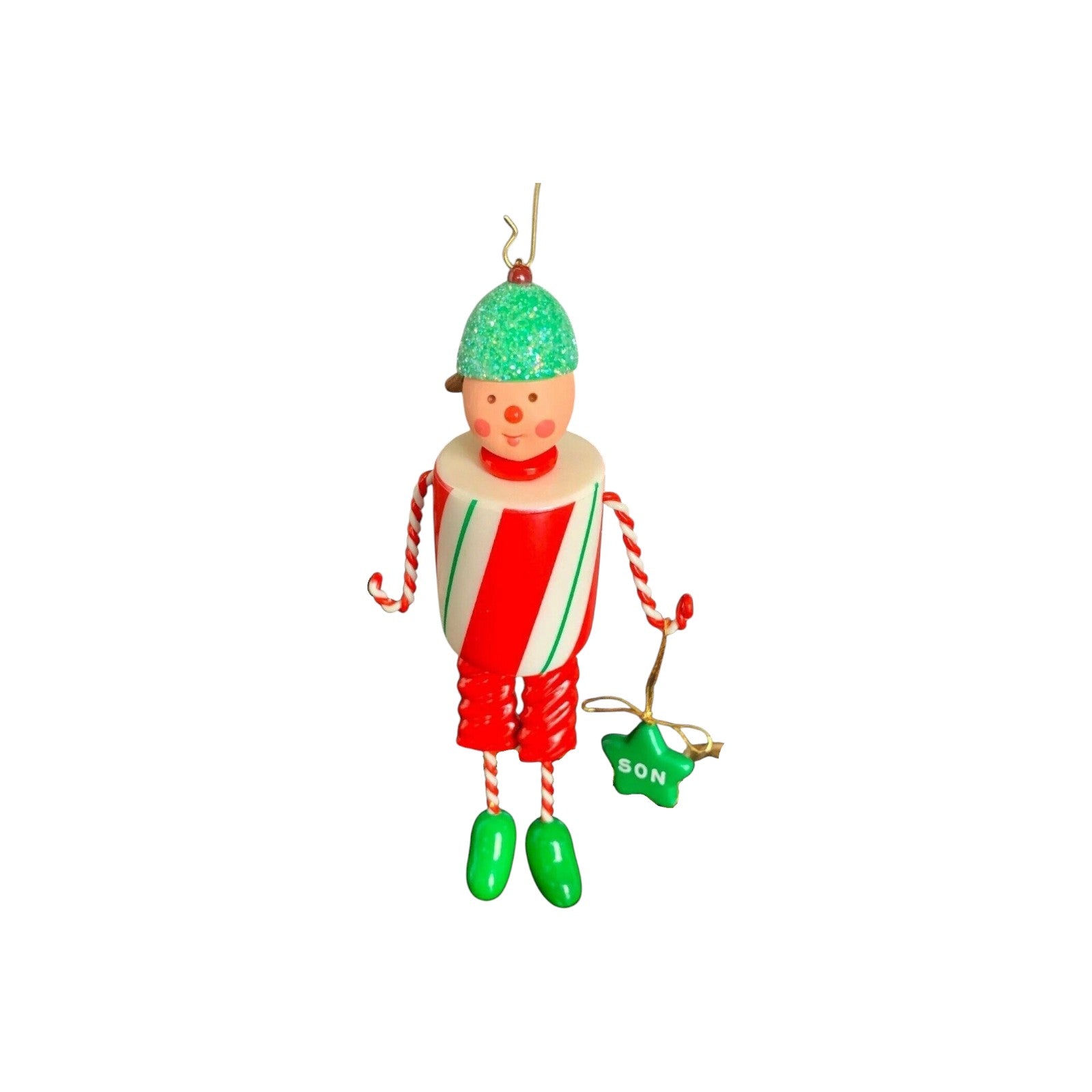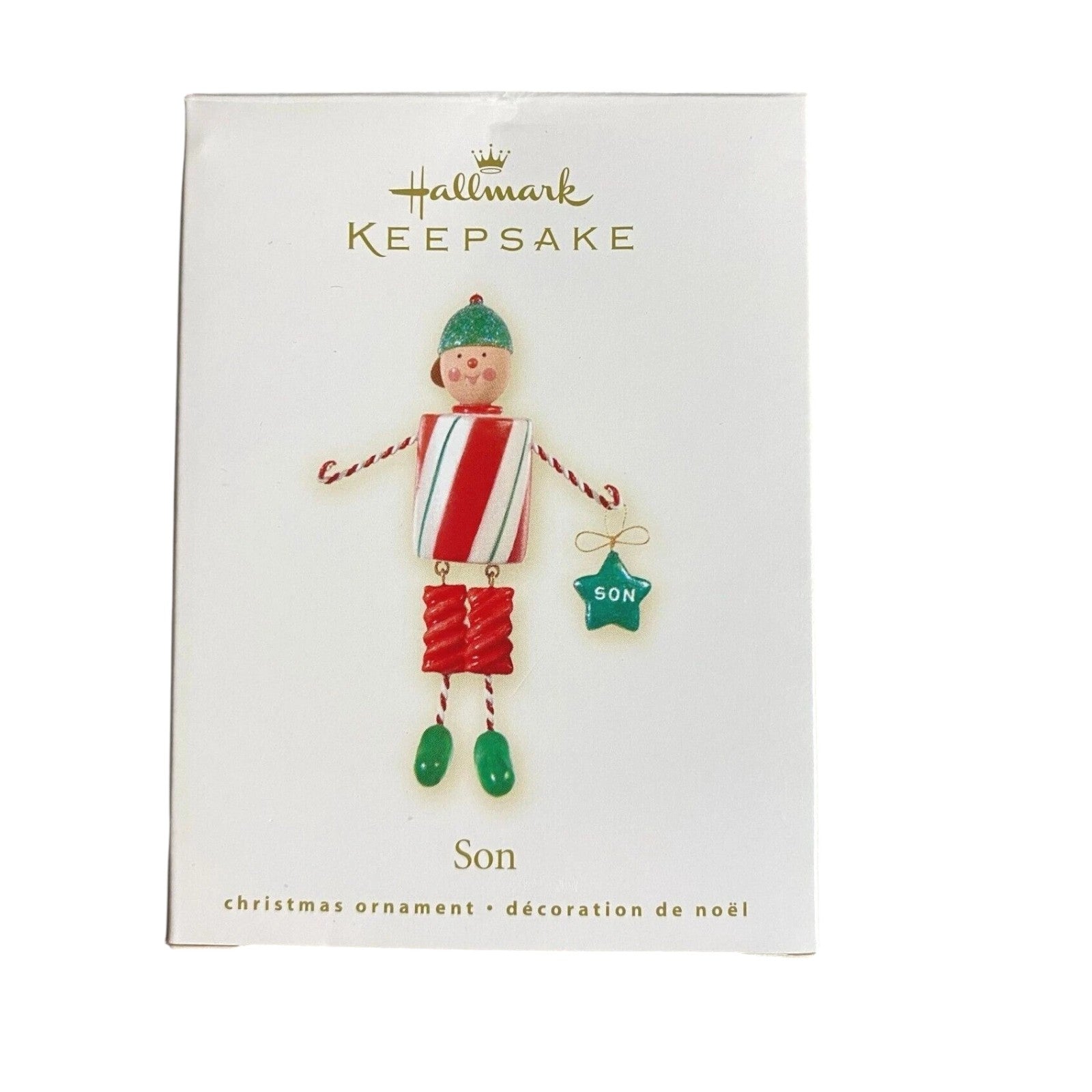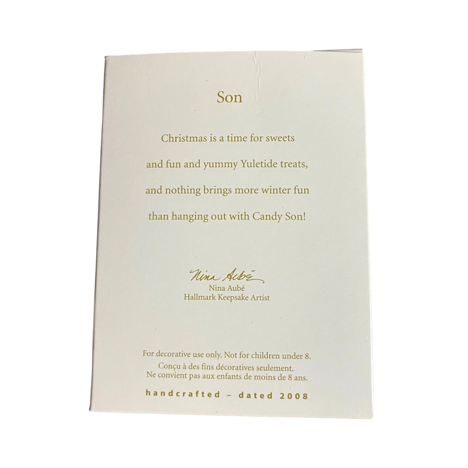 Celebrate the young boy in your life with the 2008 Keepsake ornament “Son” (SKU QXG6211) by Hallmark. This cheerful design portrays “Candy Son” — crafted to resemble a sweet holiday treat with peppermint-striped body, candy-cane arms and legs, and a bright red heart marked “Son.” Designed by artist Nina Aubé, it features vibrant holiday colors and candy-themed detailing. Standing approximately 3.75″ tall, this ornament blends festive fun with sentimental value, making it a great collectible piece for Hallmark Keepsake fans and family-themed ornament collectors alike.