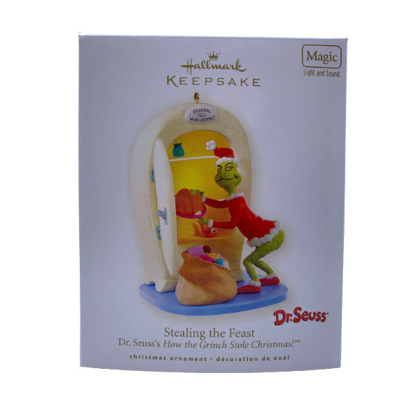 Bring mischievous holiday lore to life with this magical 2008 Hallmark Keepsake ornament, "Stealing the Feast!" Sculpted by Anita Marra Rogers, the piece portrays the Grinch in his Santa garb, slyly retrieving the roast beast from an illuminated refrigerator. With lights inside the fridge and the classic tune “You’re a Mean One, Mr. Grinch” playing at the push of a button, this Gold Crown Exclusive adds both whimsy and nostalgia to any tree. The ornament arrives mint in box, ready to surprise and delight—no assembly required.
