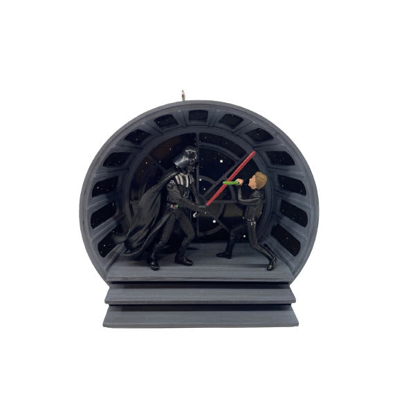 Experience the climactic lightsaber duel between Luke Skywalker and Darth Vader with this 2008 Hallmark Keepsake Magic ornament. The scene captures the iconic confrontation within the Emperor’s throne room. Press the discreet base button to illuminate the lightsabers and activate dialogue from the pivotal battle. Sculpted in high detail, this interactive piece arrives mint-in-box with batteries included—no cords required, just attach and relive the saga.