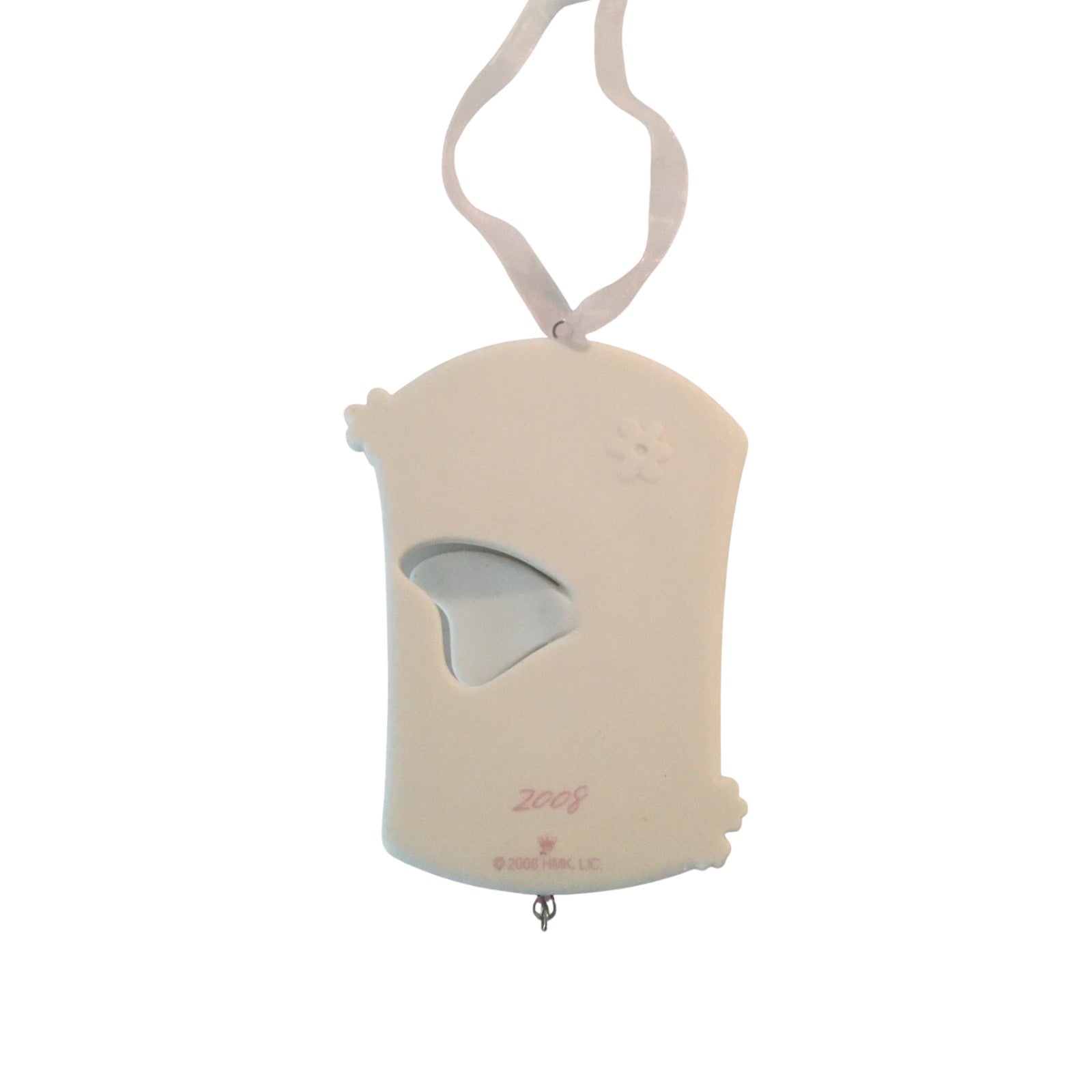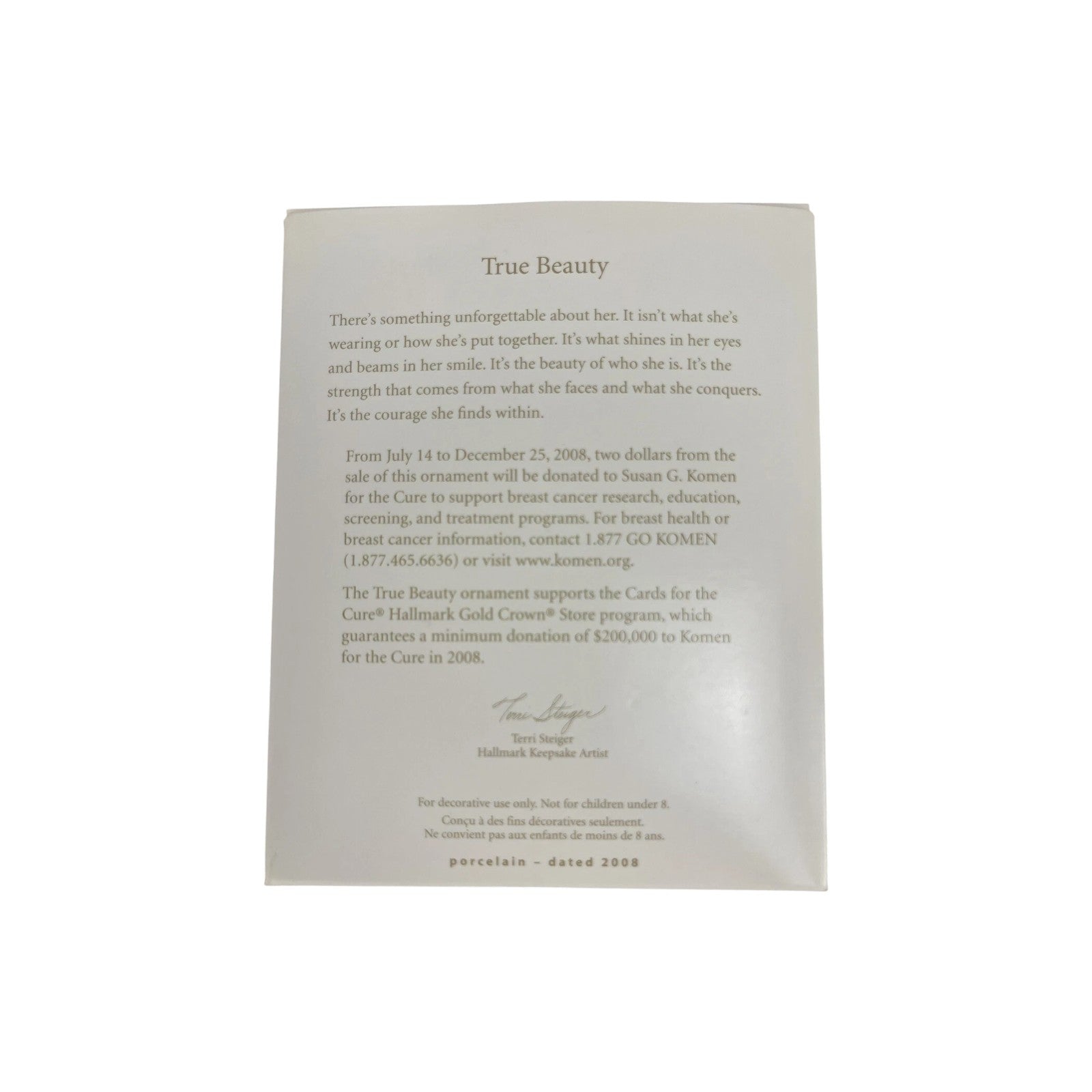 Celebrate strength, hope, and loving remembrance with the 2007 Angel of Hope ornament from Hallmark’s Susan G. Komen Breast Cancer collection. This four-inch porcelain angel comes “faceless,” serene and graceful, clad in white with beaded halo and wings. She wears a pink ribbon draped over her shoulders and holds a dove aloft in her outstretched hands. On the front of her dress is the inscription, “A woman of courage, strength, and grace.”