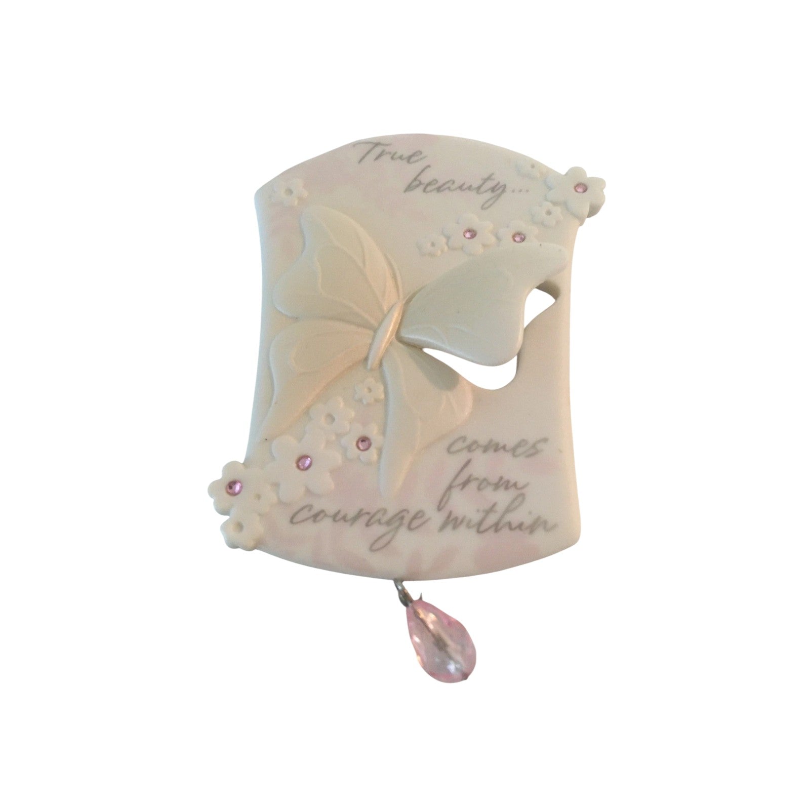 Materials: Porcelain, painted/shaded with pink and white tones with floral motif and a butterfly accent