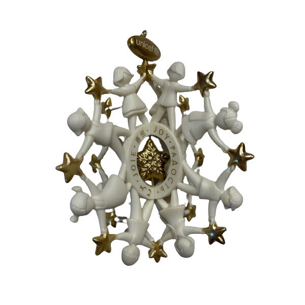 This uplifting keepsake ornament, 2008 Joy for All (UNICEF), from Hallmark’s UNICEF line, embodies hope, unity, and giving. Designed as a snowflake composed of children holding golden stars, it beautifully expresses “joy” in six languages — English, Spanish, French, Arabic, Chinese, and Russian — symbolizing a universal spirit of caring. A portion of the proceeds from its original release went to UNICEF to support children worldwide.