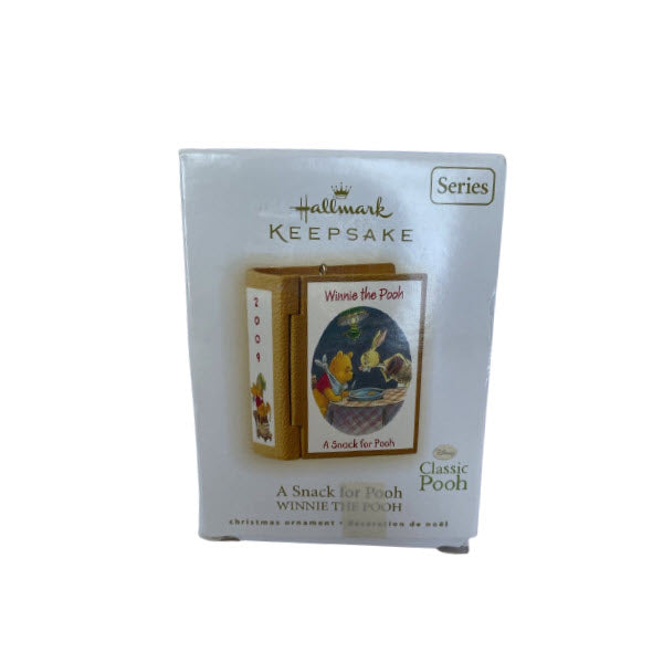 This 2009 Keepsake ornament (SKU QX8362) from Hallmark features the beloved Winnie the Pooh in book-form: the ornament is shaped like an open book and reveals a scene inside where Pooh enjoys his honey snack—only to find too much Pooh or much too little door! This is the 12th and final piece in the Pooh book-series, adding extra appeal for series-completers. Designed by artist Tracy Larsen, it stands about 2.5″ high.