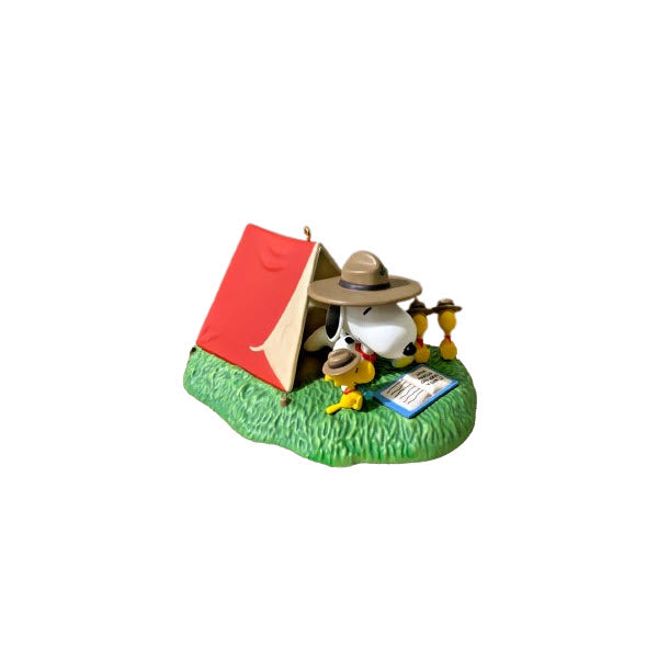 Gather around for a cozy campfire tale with this 2009 A Spooky Story! ornament. Featuring Snoopy as scout leader and a troop of Woodstock Beagle Scouts, the scene unfolds beside a red pup tent atop a grassy mound. This 4″‑wide keepsake arrives mint‑in‑box, complete with Hallmark tags and instructions. No batteries or cords needed—just hang and let the nostalgia of campfire storytelling shine.