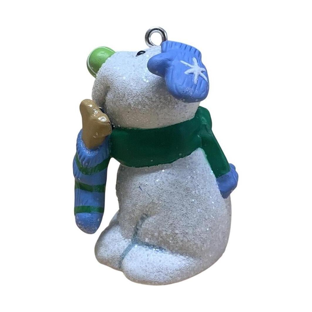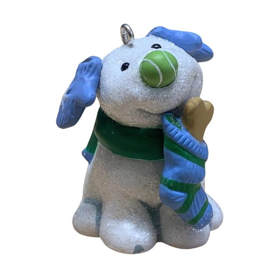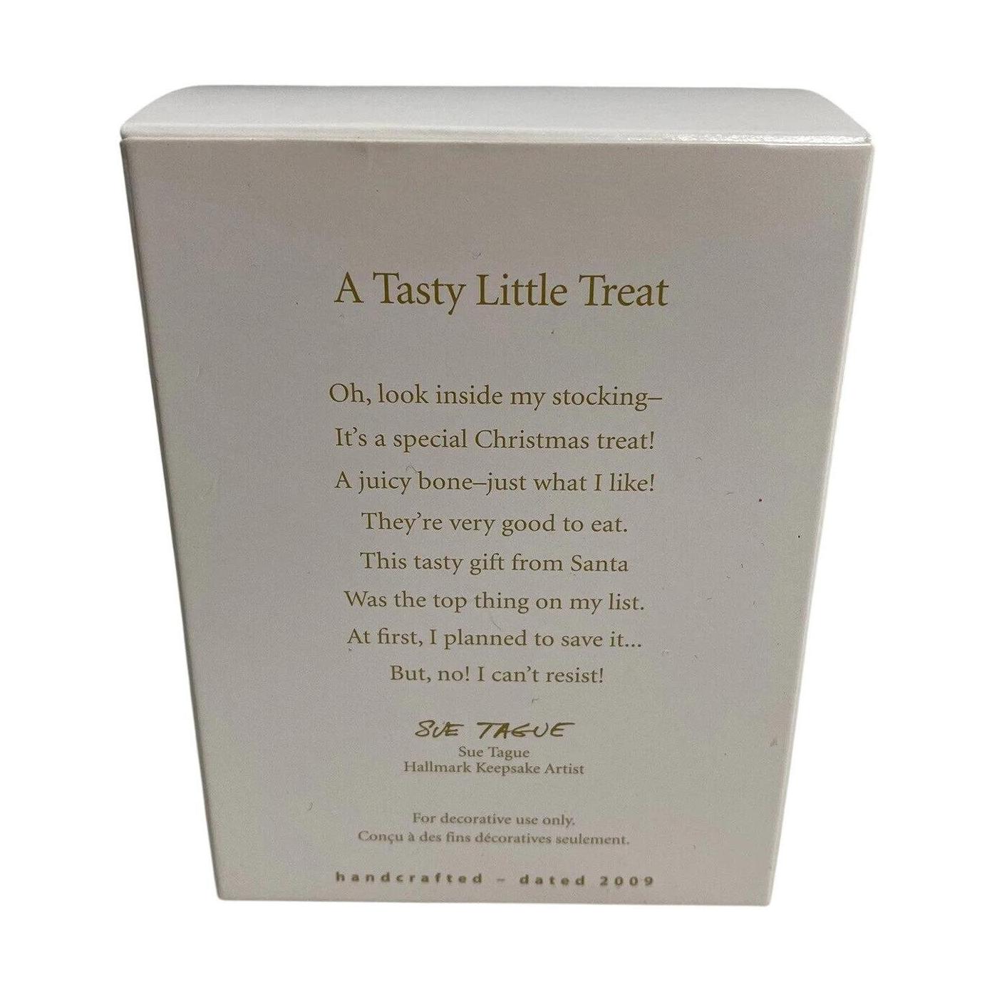 This 2009 Club-Edition keepsake ornament (SKU QX LPR3402) from Hallmark features a cheerful puppy holding a dog treat in its stocking — a playful nod to holiday indulgence for man’s best friend. Designed by artist Sue Tague, the piece is crafted in painted resin/mixed media and measures approximately 1″ H × 1⅞″ W × 1″ D. It was originally offered exclusively to Keepsake Ornament Club members, adding collector appeal.