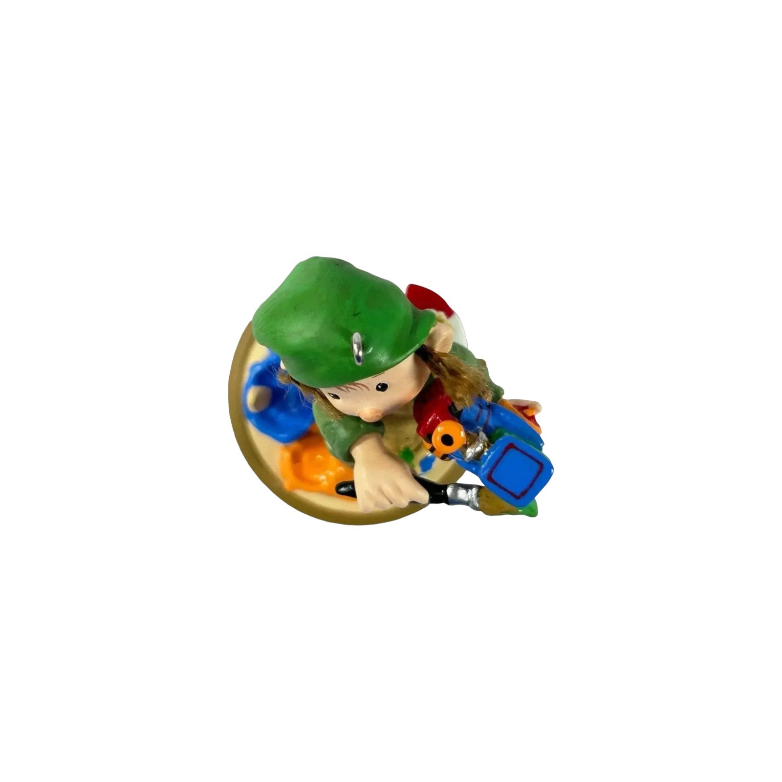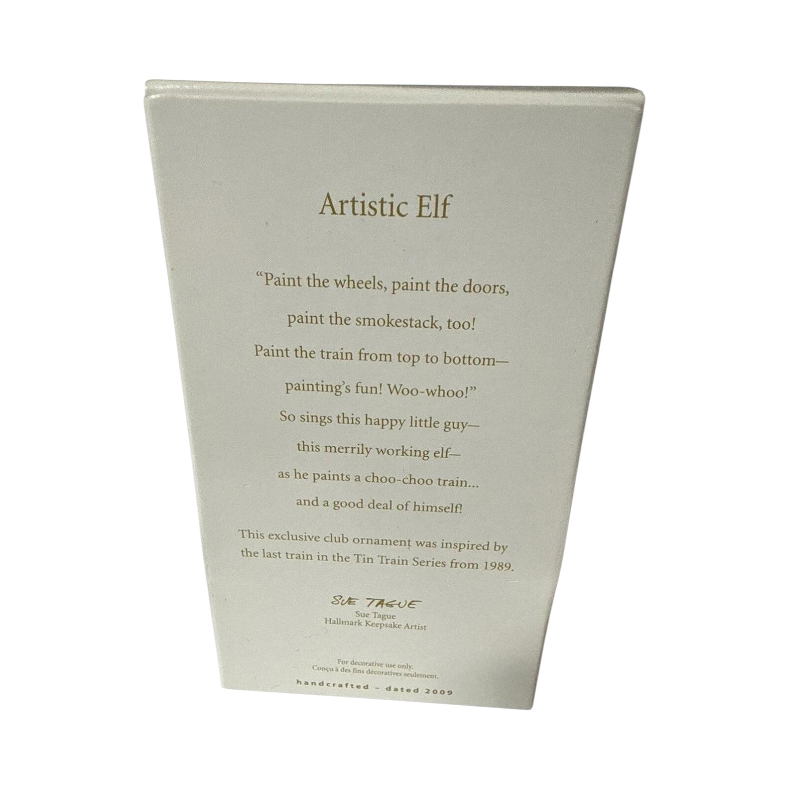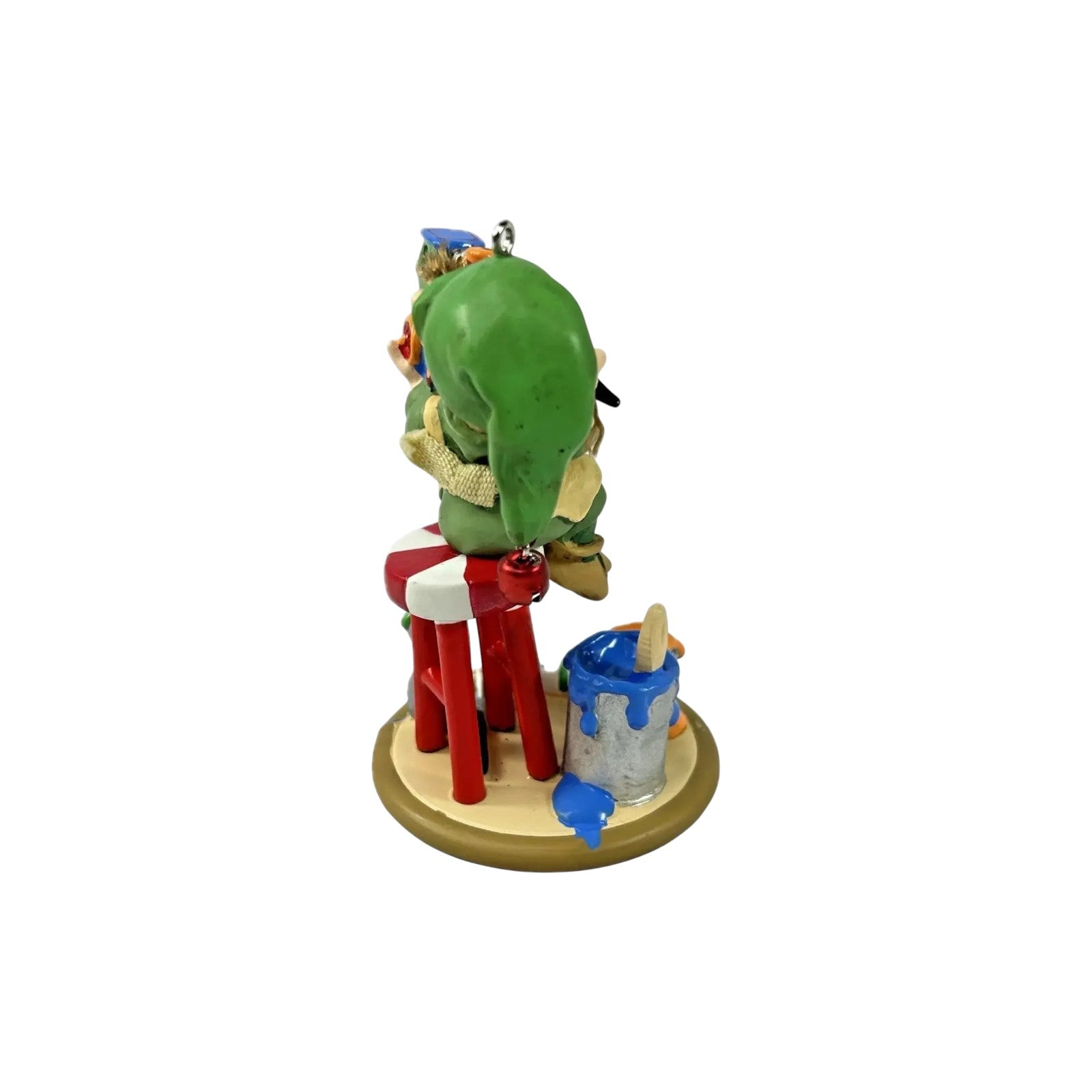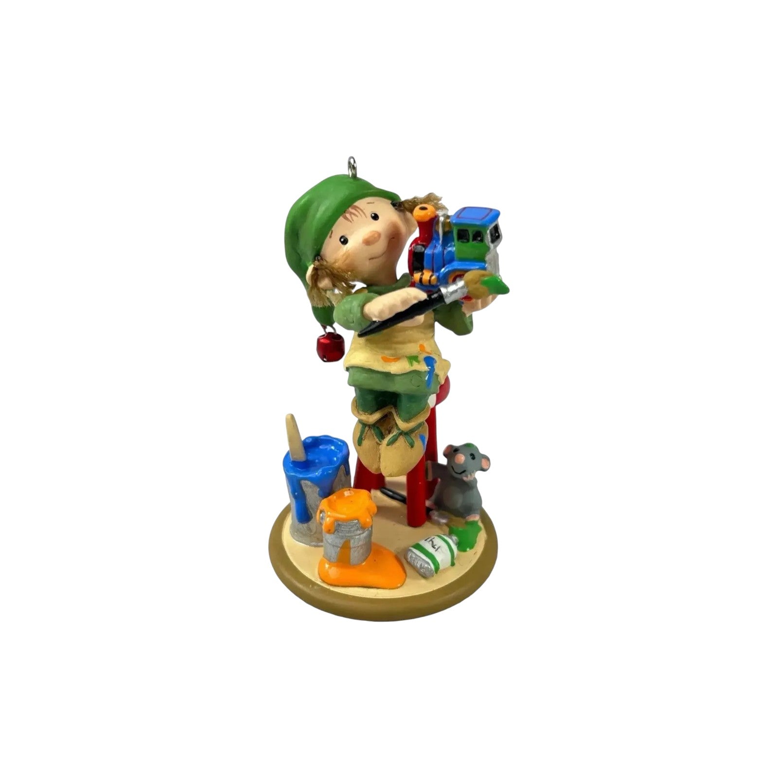 This fine 2009 Keepsake ornament (SKU QXC9022) from Hallmark captures a charming workshop scene: an elf seated on a red stool carefully painting a small toy train, with open cans of blue and orange paint at his feet and a curious mouse watching over his shoulder. It’s a whimsical tribute to Hallmark’s tin-train heritage, reflecting the last model from their Tin Train series. Designed for the Keepsake Ornament Club (Club Edition) by artist Sue Tague, it offers rich painted detail and nostalgic toy-making imagery—making it highly appealing for holiday décor or collectors of toy-themed ornaments.