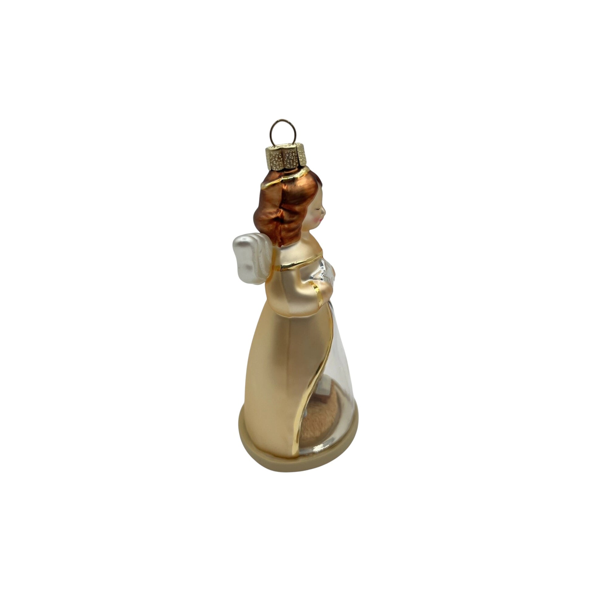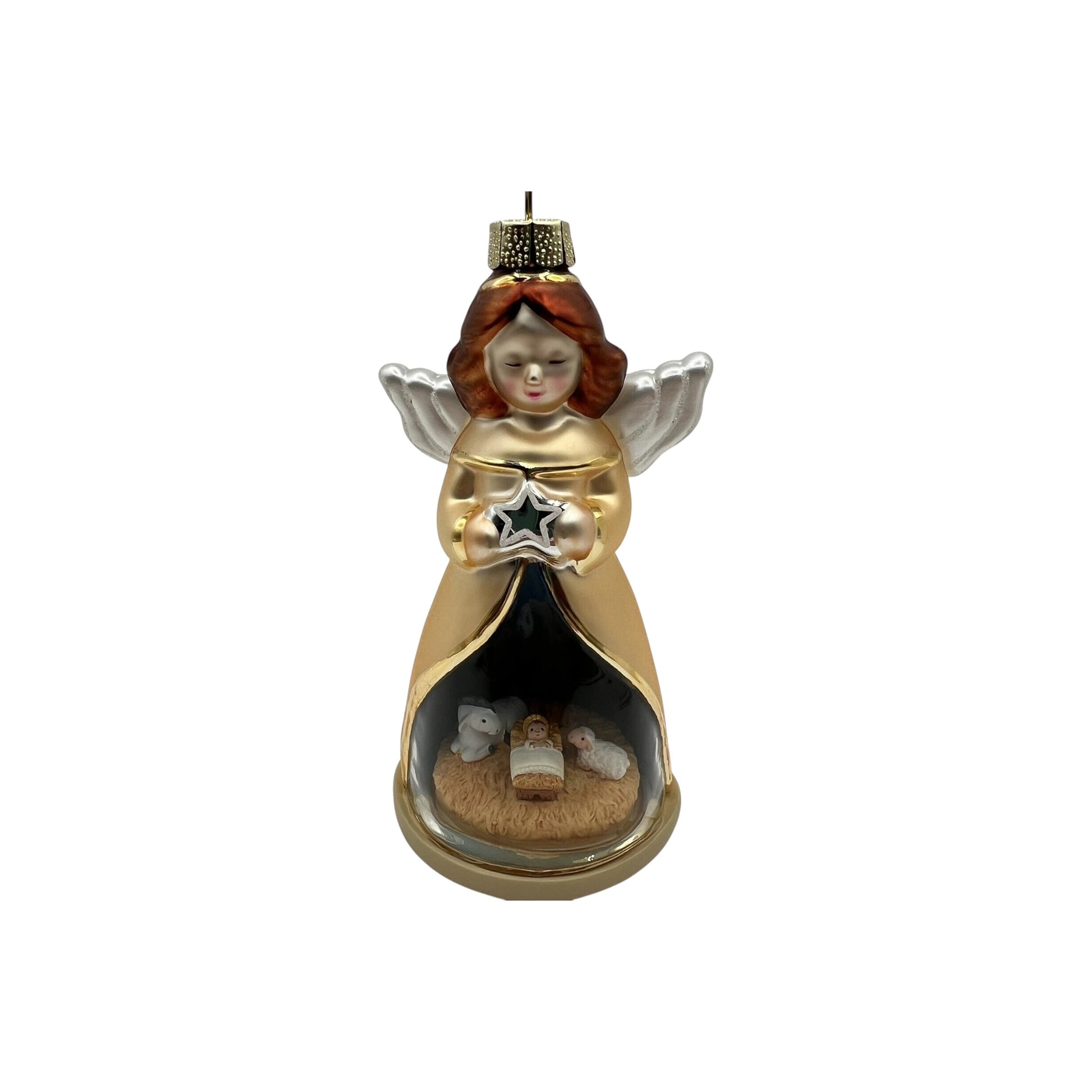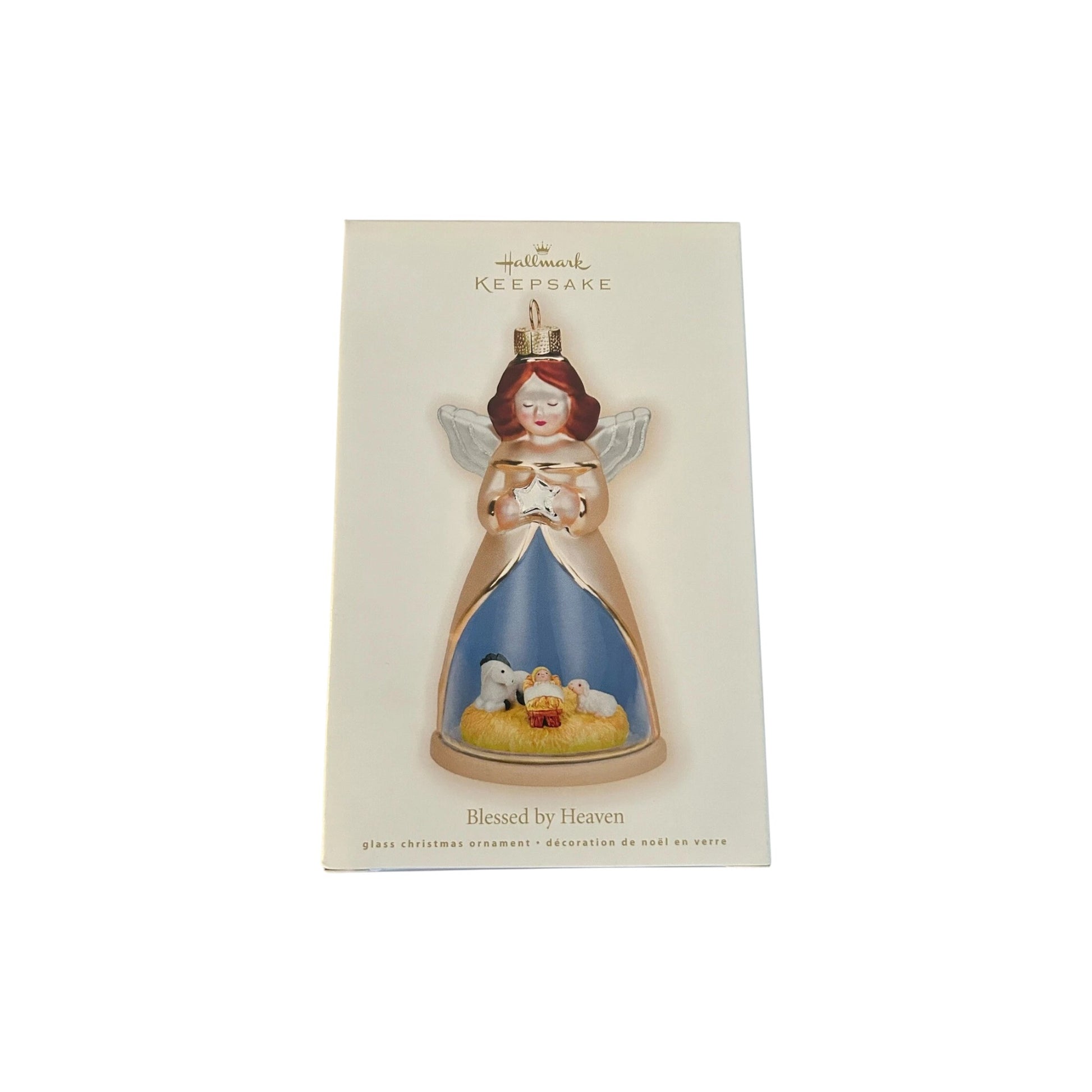Elevate your Christmas tree with 2009 Blessed by Heaven (Glass Angel), a beautifully crafted glass / handcrafted ornament from Hallmark’s Keepsake line. This angel features a cut-out nativity scene within her skirt design — an elegant blend of artistry and spiritual symbolism. According to Hooked on Hallmark, it was originally offered as a Gold Crown store exclusive.