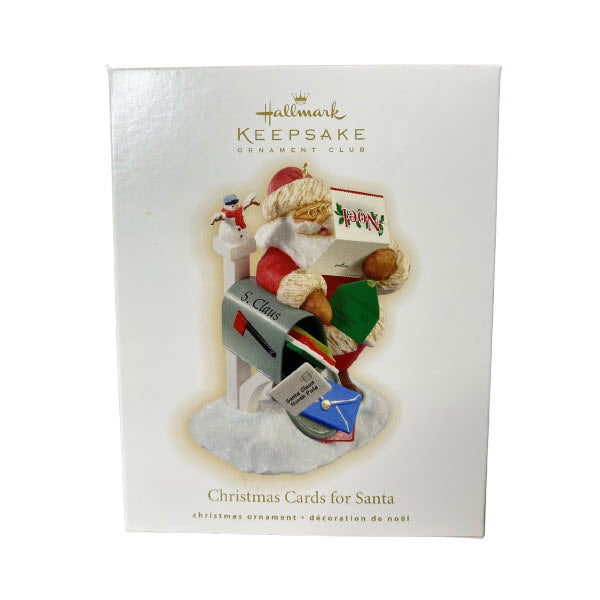 This 2009 Club-Edition ornament (SKU QX C9003) from the Hallmark Keepsake line depicts a festive Santa-mailbox scene: a classic red and white mailbox labeled “North Pole” brimming with holiday cards addressed to Santa, while a small snowman perches on top, scanning the incoming mail. Designed by artist Linda Sickman, the piece stands approximately 3.7″ H × 3″ W × 2.6″ D and carries a nostalgic charm, celebrating the tradition of sending holiday greetings and the magic of the season.