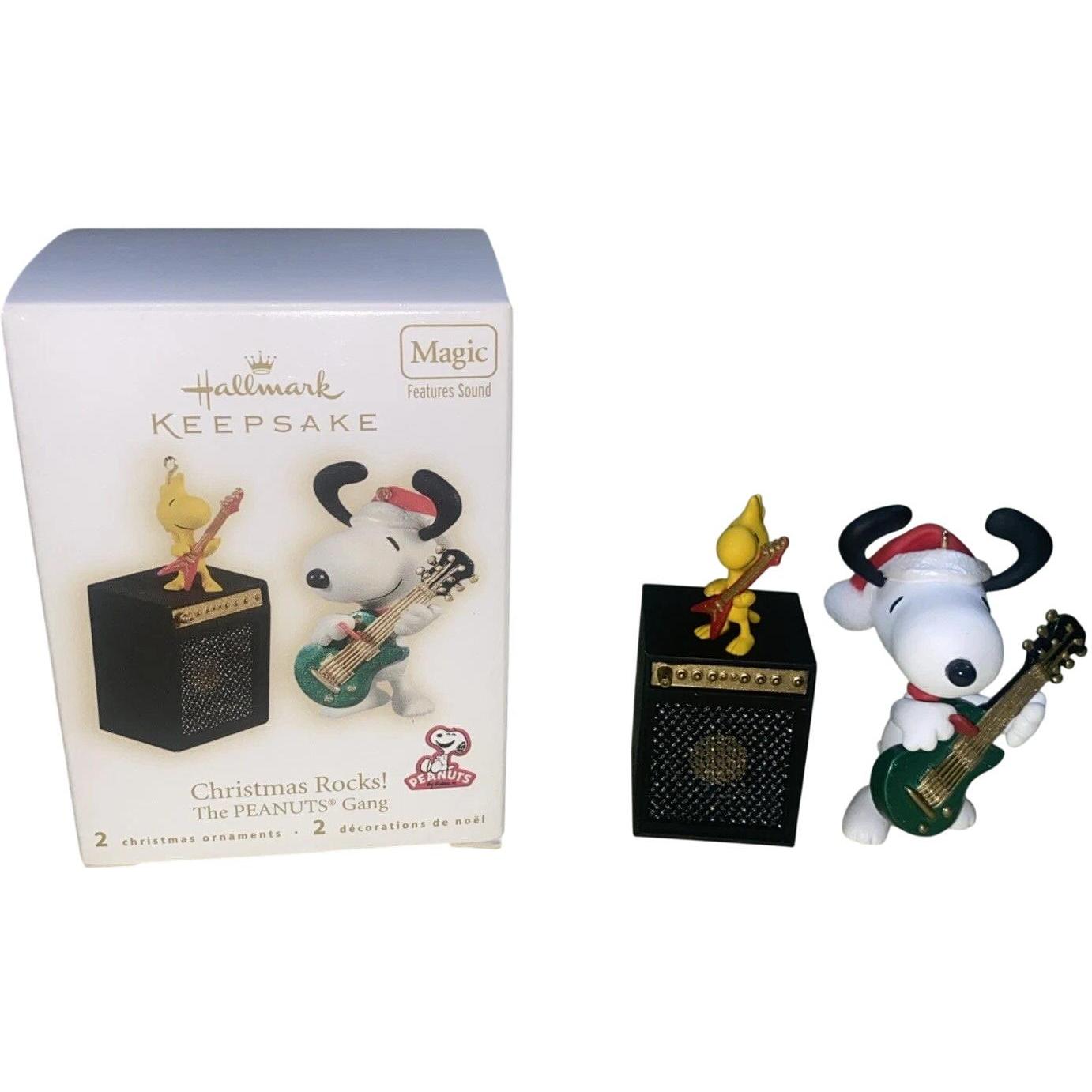Turn up the holiday cheer with this lively 2009 Hallmark Christmas Rocks! ornament featuring Peanuts icons Snoopy and Woodstock as rock stars. Snoopy shreds on his electric guitar while Woodstock perches atop an amplifier, playing along with high-energy spirit. Press the button on the amplifier to enjoy two classic Christmas carols brought to life through this musical keepsake. Mint-in-box and complete with its original hang tag, this collectible arrives ready to rock your tree. It includes 3 LR44 batteries (installed), so no extra power accessories are needed.
