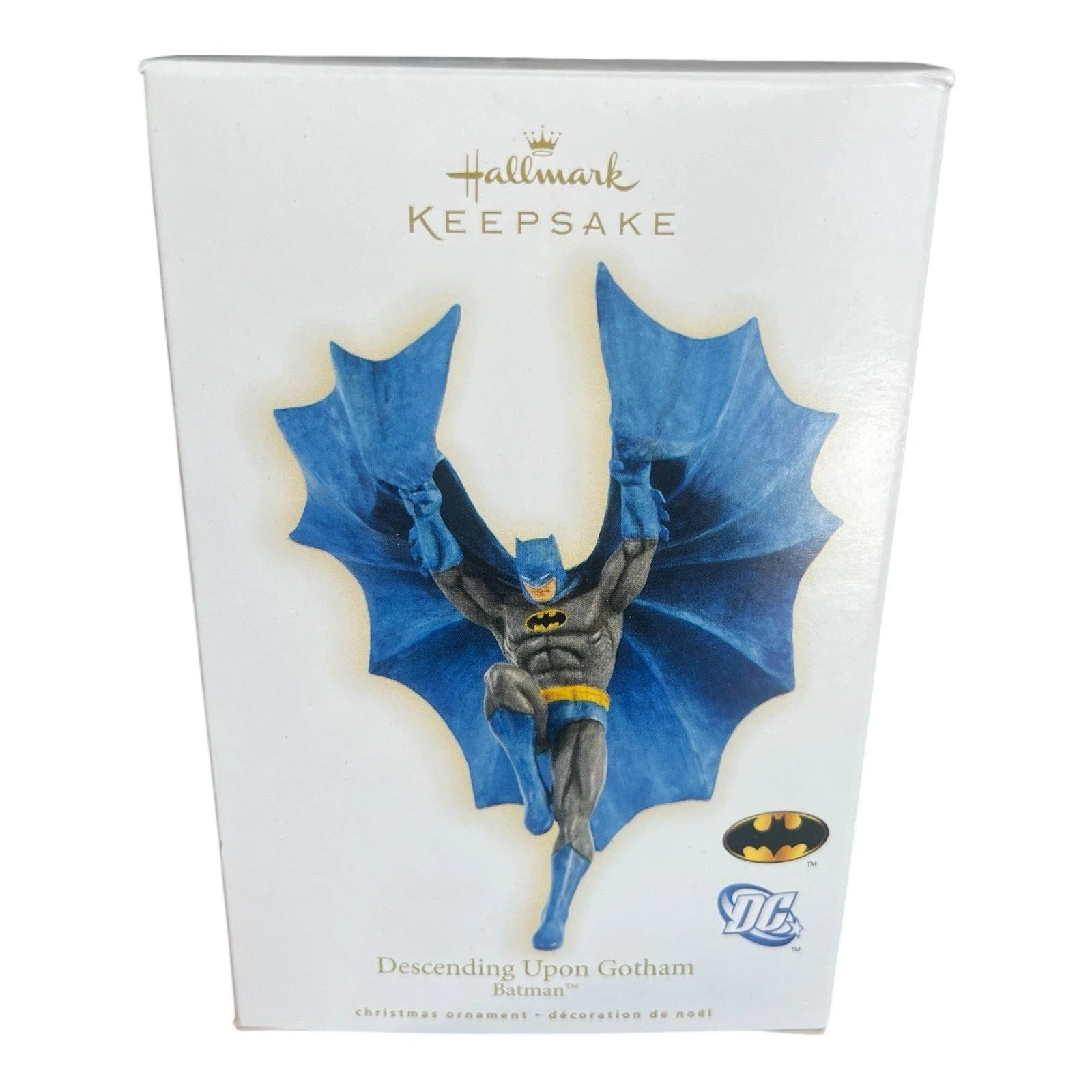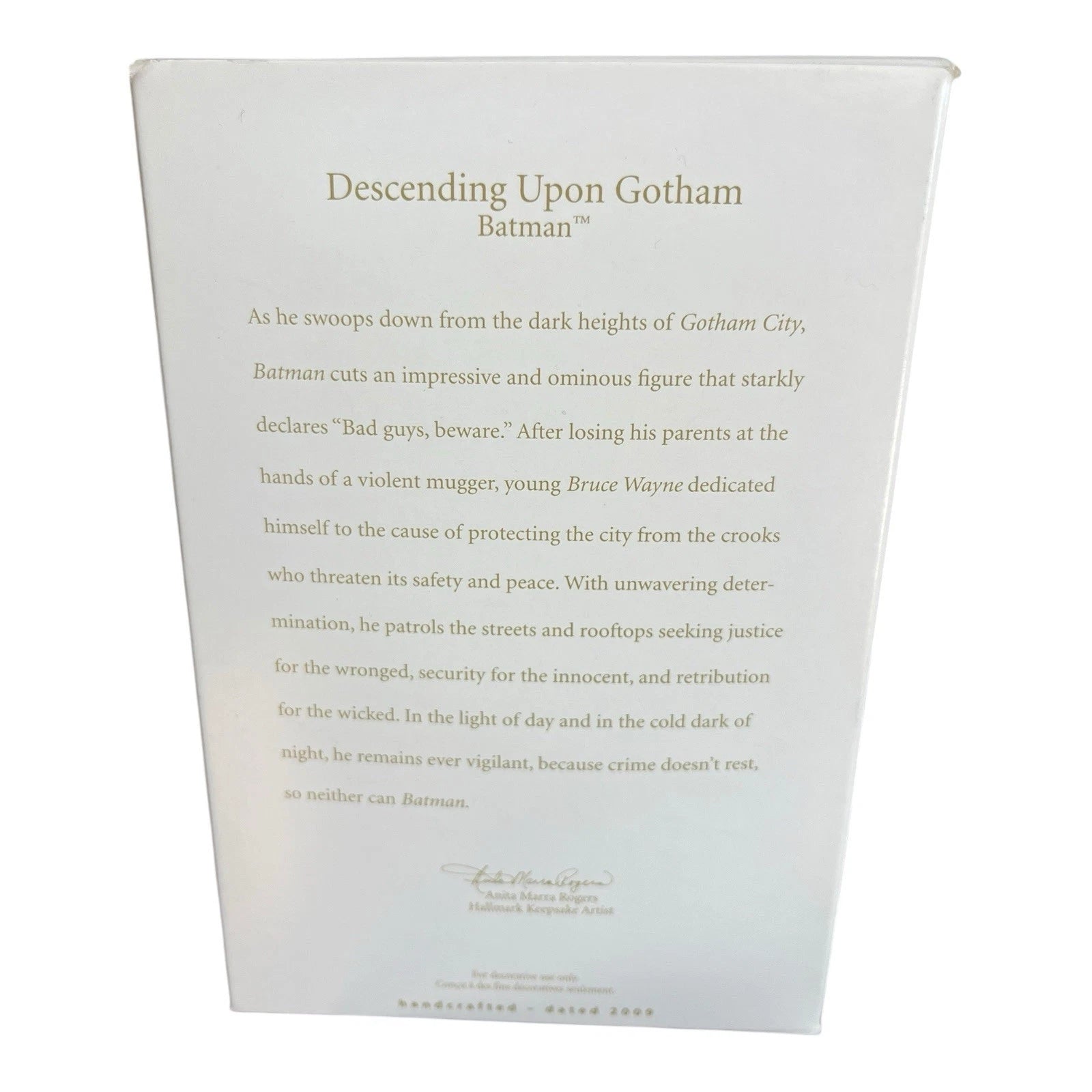 In 2009 Descending Upon Gotham, your holiday display becomes a dramatic scene as Batman soars into action from the shadowy heights of Gotham City, declaring “Bad guys, beware.” The sculpture features Batman with cape unfurled, descending with intensity to protect the city. The ornament arrives in its original keepsake box along with a hanger ribbon and Hallmark hang tag. This collector’s piece is purely decorative—no batteries, cords, or light strings are necessary.