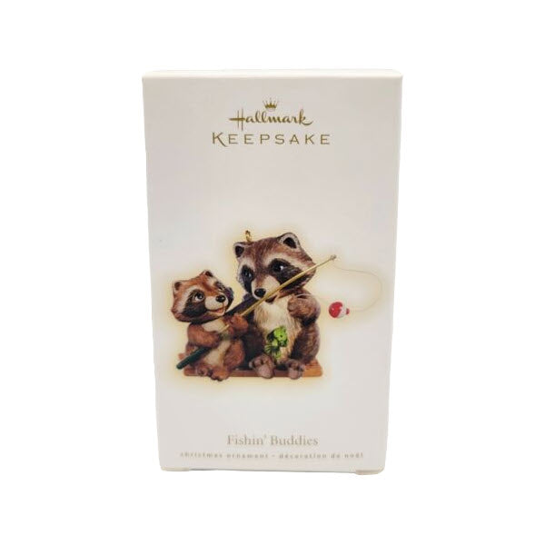 Create heartwarming holiday memories with the 2009 Fishin’ Buddies ornament from Hallmark’s Fishing series. This adorable keepsake captures two masked raccoons—one teaching the youngster how to fish—reeling in a little green metal fish lure with a bright red bobber in a charming outdoor moment. Designed by Tammy Haddix, it arrives mint-in-box with the original tag and requires no batteries, cords, or lights.