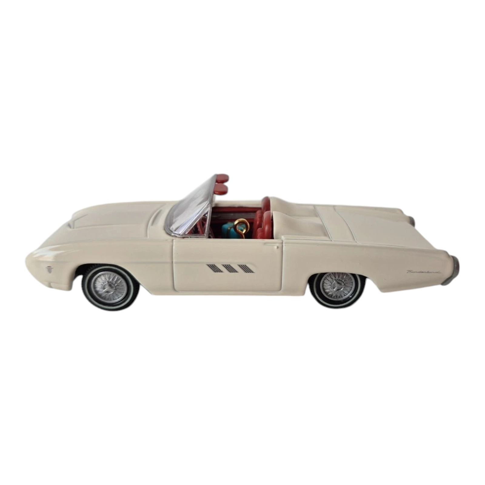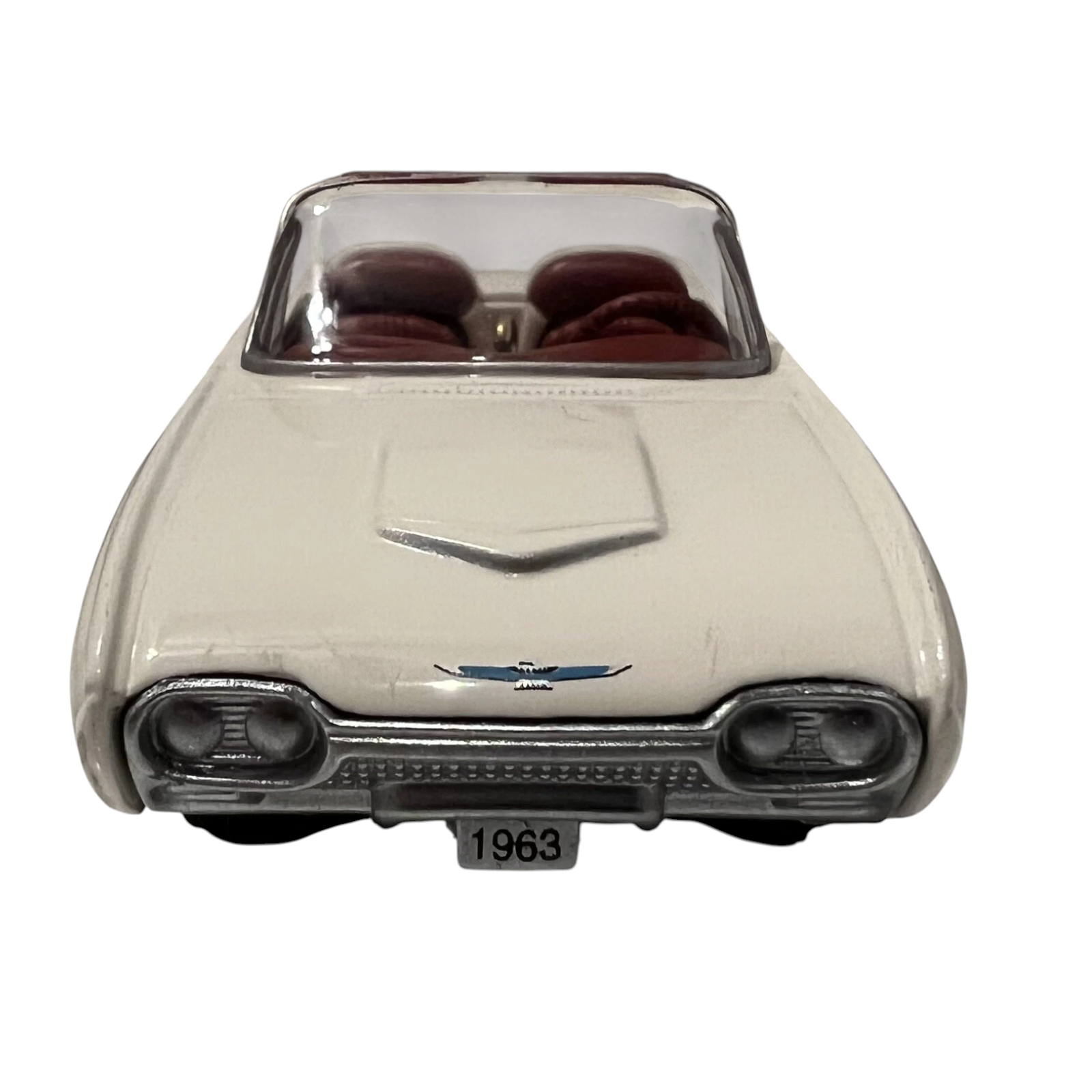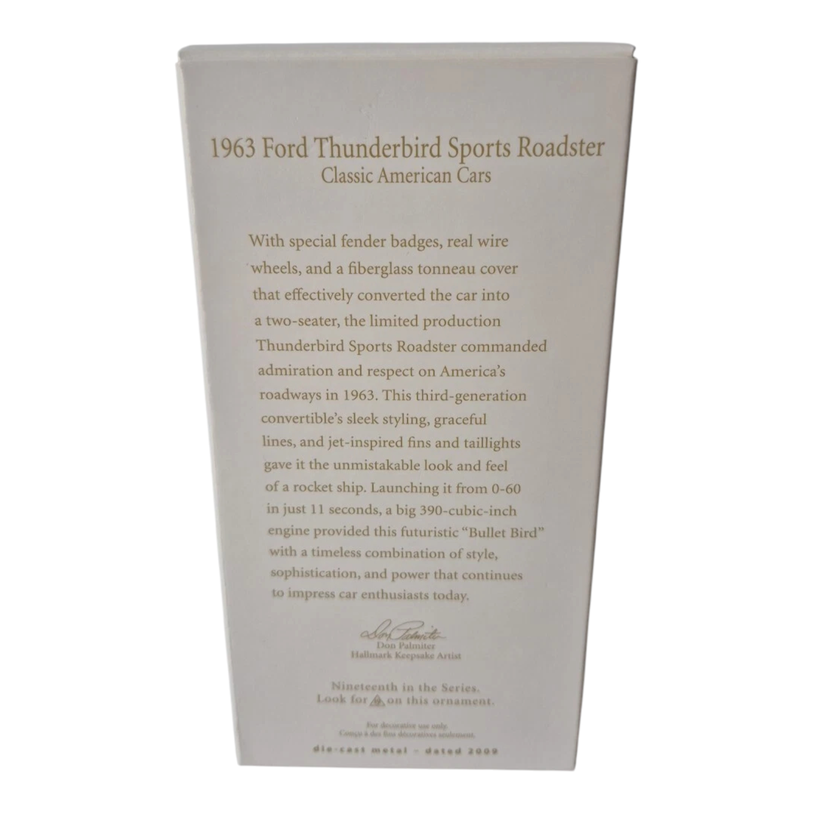 Add some sleek style to your holiday décor with the 1963 Ford Thunderbird Sports Roadster, the nineteenth ornament in Hallmark’s Classic American Cars series—released in 2009. Crafted by Don Palmiter, this meticulously detailed die-cast keepsake adorns your tree with features like real wire wheels, special fender badges, and a fiberglass tonneau cover—transforming the iconic convertible into a streamlined two-seater. The front license plate reads 1963 (the car's model year), and the rear plate reads 2009 (the ornament's release year). Rolling wheels add a fun, interactive touch, and no power is needed—just hang and let this classic cruise into the festive season.