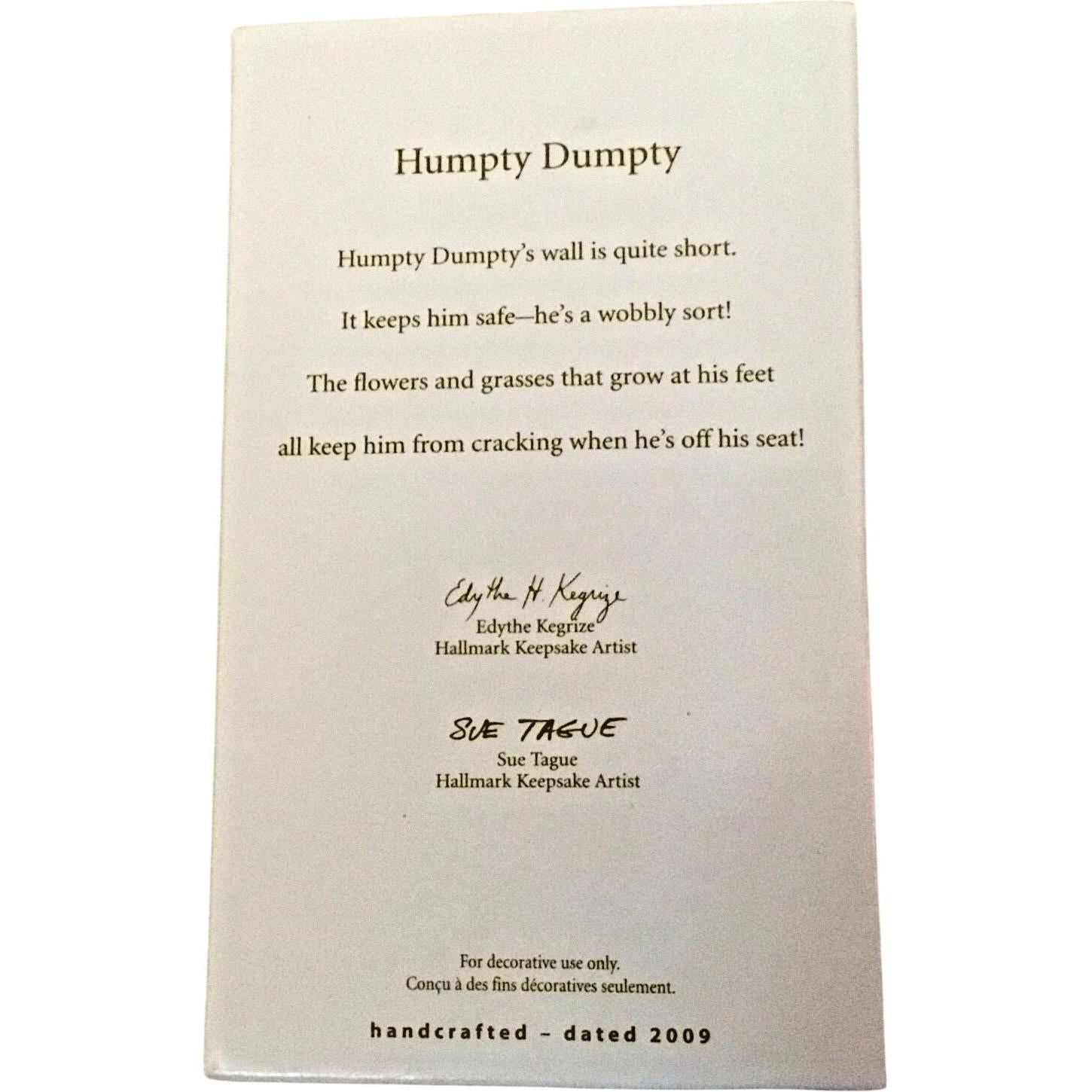 Bring a bit of childhood nostalgia to your holiday décor with 2009 Humpty Dumpty. This Hallmark Keepsake ornament features Humpty Dumpty sitting on a garden-wall, holding a flower, with springy poseable arms and legs that give him a playful, “wobbly” motion. Crafted by artists Edythe Kegrize & Sue Tague, the ornament stands ≈ 3.3″ high × 3.1″ wide × 2.2″ deep. It comes in its original box.