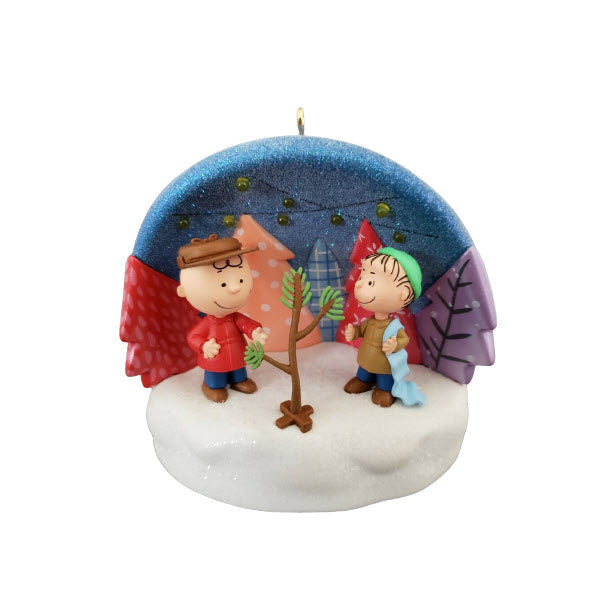 Celebrate the iconic scene from A Charlie Brown Christmas with this 2009 Just the Right Tree ornament. Charlie Brown and Linus stand by their perfect little spruce under festive pedigree lights. This light-and-sound magic piece twinkles when plugged into a UL-listed miniature light string, and activating the button plays their charming conversation about the "right" Christmas tree. No batteries or cords required. Arrives mint in original Hallmark box, complete with tags and instructions.