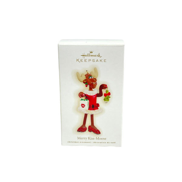 Spread a little holiday humor with the 2009 edition of the Hallmark Keepsake Ornament titled Merry Kiss-Moose (SKU QXG6702). This cheeky piece features a glamorous female moose wearing Christmas lights as earrings, holding a gift sealed with a red “kiss,” and mistletoe held aloft—inviting her lucky companion for that seasonal smooch. Designed by artist Sue Tague, the ornament stands approximately 4″ high, crafted in painted mixed media, and radiates fun for collectors of animal motifs, novelty ornaments, or those looking to add a whimsical accent to their holiday décor.