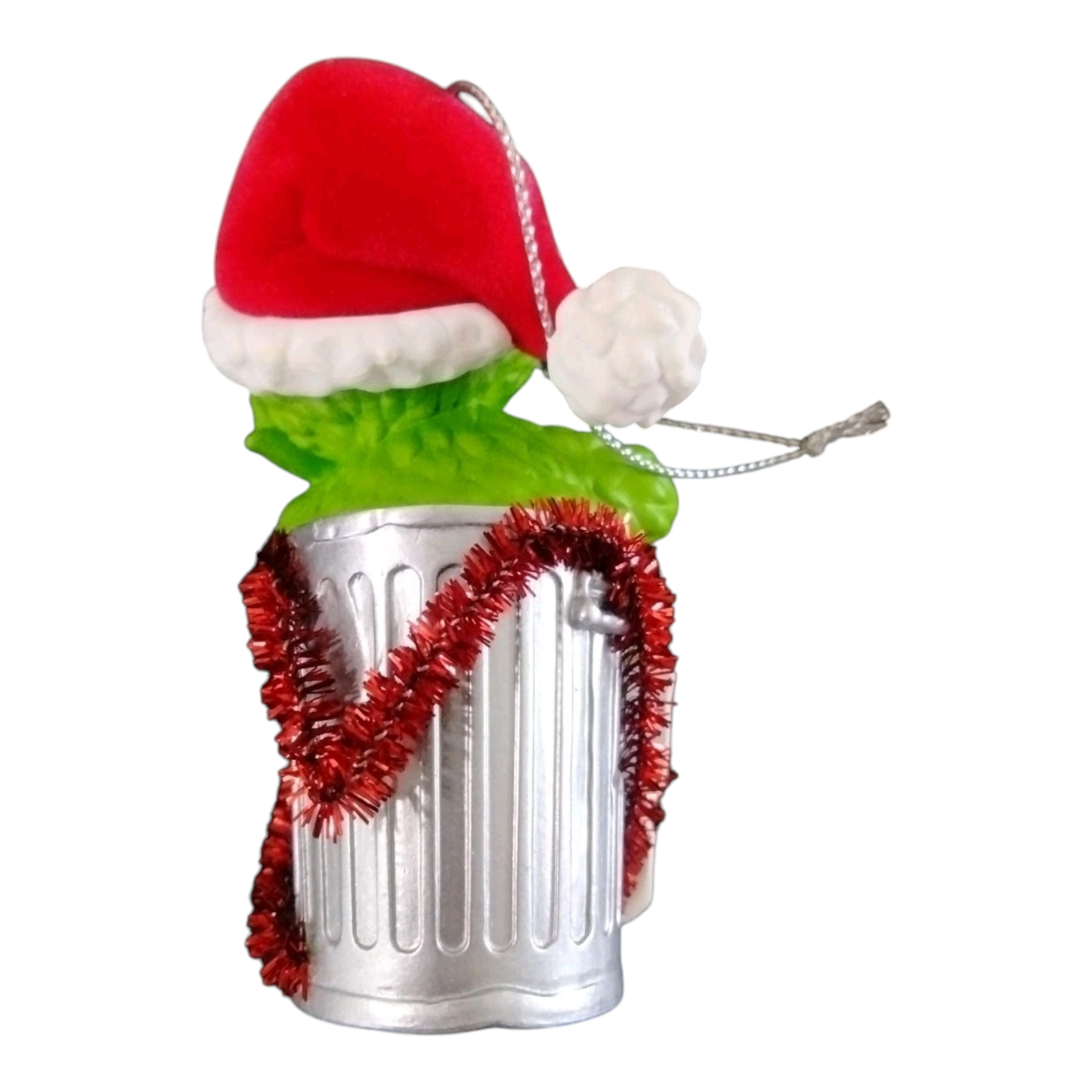 This playful ornament from the 2009 Carlton Cards Heirloom “Sesame Street” series features the beloved muppet Oscar the Grouch emerging from his signature garbage can, captured in vibrant greens and grays with fine painted detail. Molded in high-quality plastic or composite and finished with a holiday-ready hanging loop, it’s perfect for fans of the show, colourful tree decorations, and vintage ornament collectors alike. Its licensed character theme and date-specific release add to its collectible appeal.
