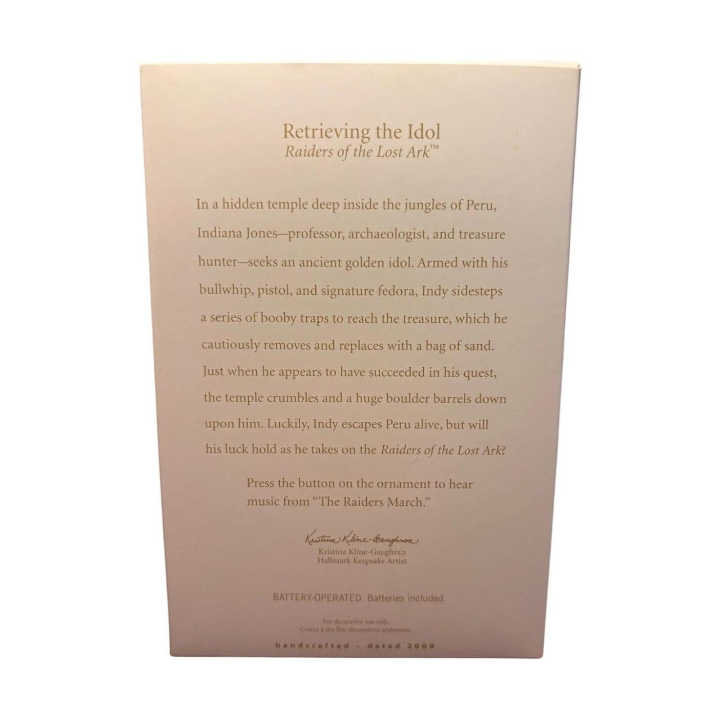 This “Magic” model from Hallmark brings to life the dramatic opening scene of Raiders of the Lost Ark, where Indiana Jones deftly swaps out the golden idol for a bag of sand in a booby-trapped temple. Pressing the activation button triggers the iconic “Raiders March” theme, adding motion and sound to the handcrafted resin and plastic ornament. With its licensed film tie-in, collector appeal and interactive feature, this piece stands out for film fans and ornament enthusiasts alike.This “Magic” model from Hallmark brings to life the dramatic opening scene of Raiders of the Lost Ark, where Indiana Jones deftly swaps out the golden idol for a bag of sand in a booby-trapped temple. Pressing the activation button triggers the iconic “Raiders March” theme, adding motion and sound to the handcrafted resin and plastic ornament. With its licensed film tie-in, collector appeal and interactive feature, this piece stands out for film fans and ornament enthusiasts alike.