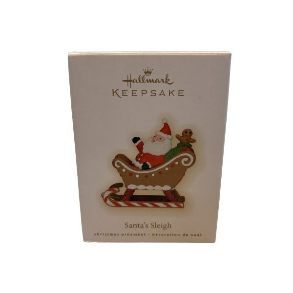 Bring gingerbread-charm and holiday warmth to your tree with 2009 Santa’s Sleigh (Santa’s Sleigh). This miniature Keepsake ornament shows Santa riding in a gingerbread sleigh with candy-cane skis, piping trim, and a faithful gingerbread helper by his side. The piece is part of Hallmark’s Santa’s Sleigh Collection, created by artist Edythe Kegrize. It comes in its original box and requires no batteries, cords, or lights—just hang and enjoy the sweet festive detail.