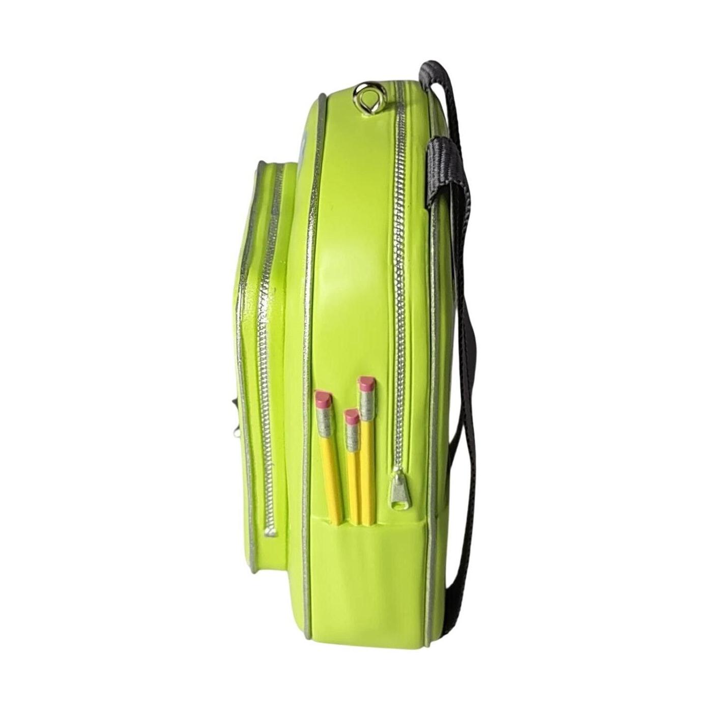 This 2009-dated ornament from the Hallmark Keepsake line (SKU QXG6725) is a photo-holder style piece designed as a green backpack marked with “09”. It allows you to insert a photo—perfect for commemorating a school moment or first day of class.